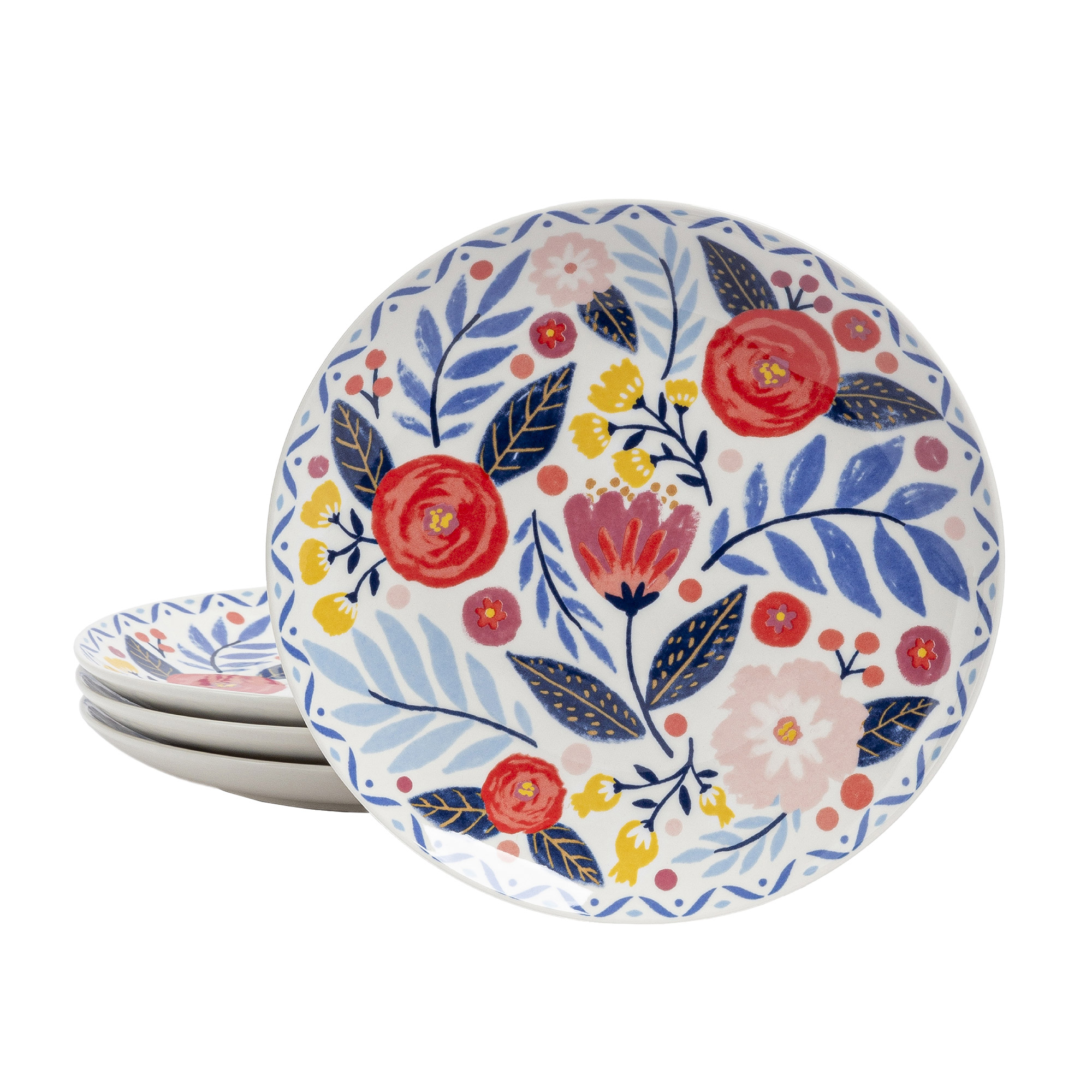 Jess Phoenix draws her inspiration from bouquets containing a medley of flowers, including roses, camellias, daisies, and petunias mingled with hues of yellow, blue, and coral to create a cheerful tablescape. This set of four stoneware salad plates is fantastic for salads, desserts and appetizers.