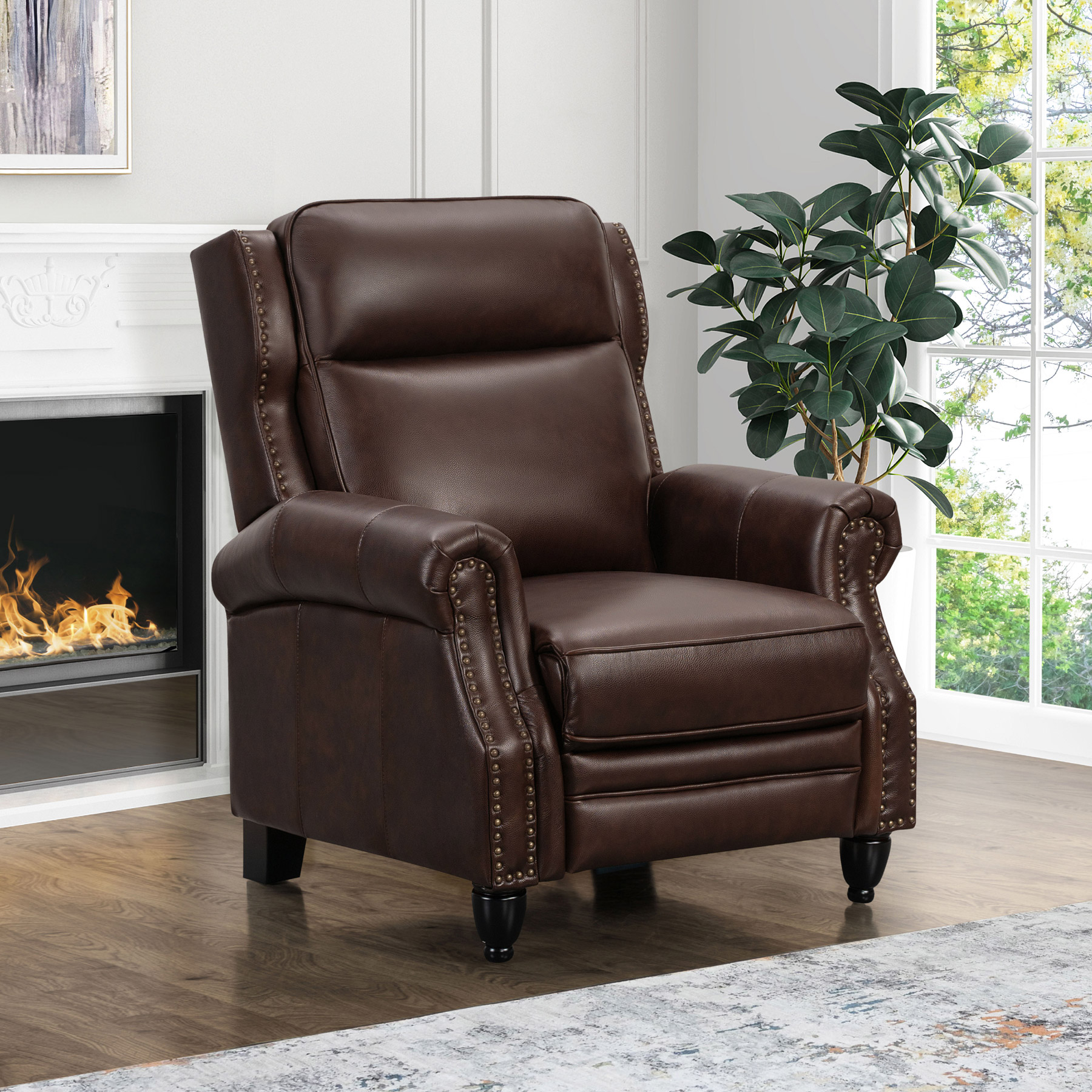 The Pollenzo Leather Pushback Recliner by Abbyson is a must have for your casual living room or entertainment area, with its smooth reclining operation and luxurious seating. The Pollenzo features steel mechanisms with unique pushback functionality, which eliminates the need for a bulky recliner handle. Simply pushback and enjoy multiple reclining positions. To increase the comfort level, the seat cushion consists of a high-density polyurethane seat core, topped with a plush fiber blend, which creates a comfortable and supportive feel. Both the seat and back cushions are sewn-in and fully attached, which helps keep them from sliding out of place.