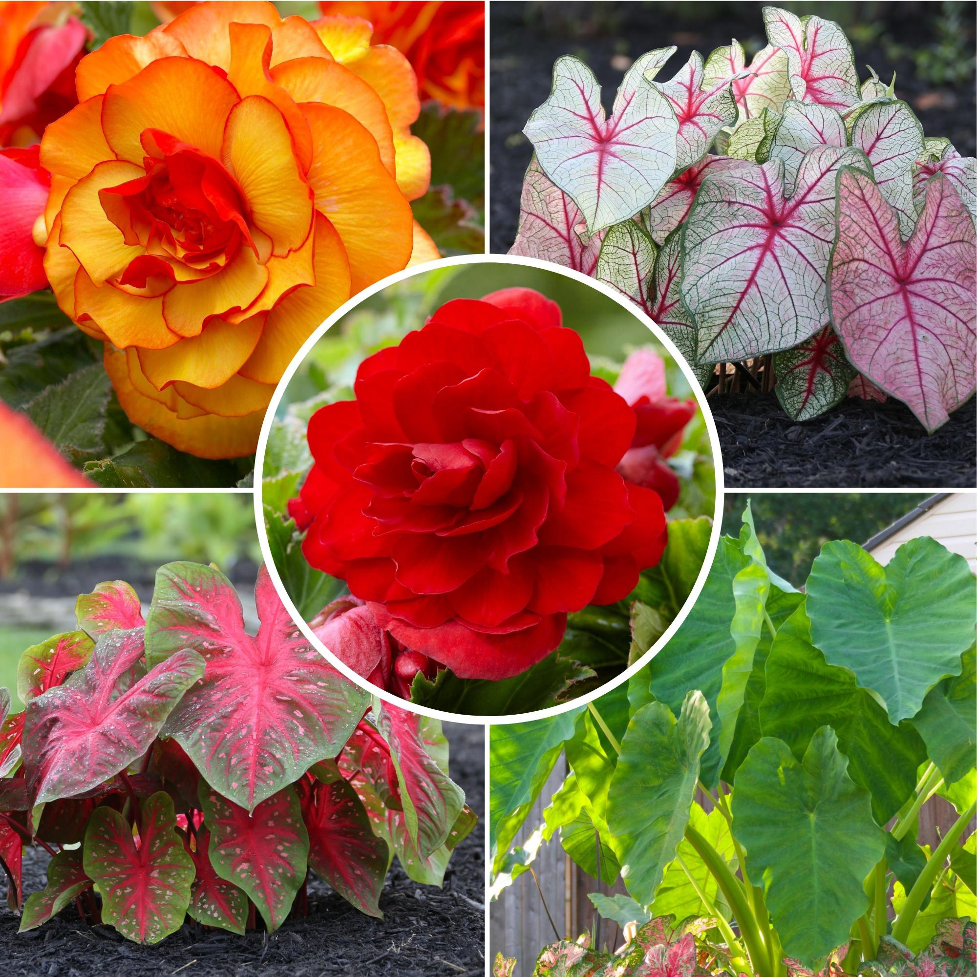 Brighten shady areas around your home with these colorful summer bulbs. This collection includes begonias with big, rose-like flowers, fancy-leaved caladiums and the giant, heart-shaped foliage of elephant ears. Plant them directly in the garden or in containers for easy, all summer color.