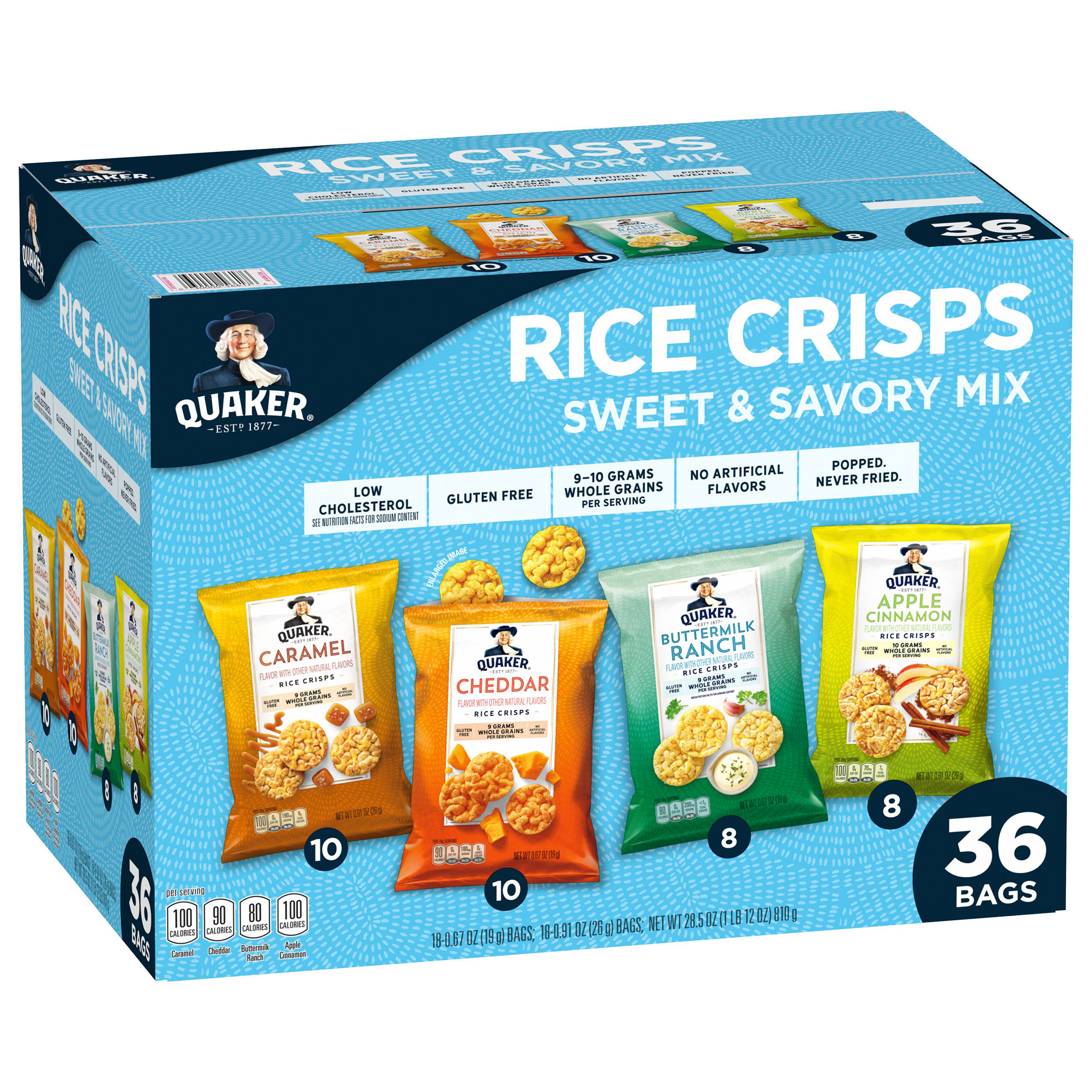 QUAKER RICE CRISPS CARAMEL: WHOLE GRAIN BROWN RICE FLOUR, SUGAR, DEGERMINATED MILLED CORN, CORN MALTODEXTRIN, SWEETENED CONDENSED MILK (MILK, SUGAR), INVERT SUGAR, SALT, NATURAL AND ARTIFICIAL FLAVOR, SUNFLOWER OIL, SOY LECITHIN, CARAMEL COLOR, SUCRALOSE, ACESULFAME POTASSIUM, TOCOPHEROLS (PRESERVATIVE). CONTAINS MILK AND SOY INGREDIENTS. QUAKER RICE CRISPS CHEDDAR: WHOLE GRAIN BROWN RICE FLOUR, DEGERMINATED MILLED CORN, SUNFLOWER OIL, DRY WHEY, SALT, MALTODEXTRIN, CHEDDAR CHEESE (CULTURED MILK, SALT, ENZYMES, ANNATTO [COLOUR]), BUTTER OIL, MONOSODIUM GLUTAMATE, LACTIC ACID, TRICALCIUM PHOSPHATE, DISODIUM PHOSPHATE, CALCIUM LACTATE, BLUE CHEESE (CULTURED MILK, SALT, ENZYMES), CITRIC ACID, GUM ARABIC, NATURAL FLAVOR, BUTTER (CREAM, SALT), TOCOPHEROLS (PRESERVATIVE), ANNATTO EXTRACT (COLOR), ENZYME MODIFIED CHEDDAR CHEESE (CULTURED MILK, SALT, ENZYMES). CONTAINS MILK INGREDIENTS. QUAKER RICE CRISPS BUTTERMILK RANCH: WHOLE GRAIN BROWN RICE FLOUR, DEGERMINATED MILLED CORN, SUNFLOWER OIL, SALT, BUTTERMILK POWDER, CORN MALTODEXTRIN, PALM OIL, TOMATO POWDER, CORN SYRUP SOLIDS, DEXTROSE, ONION POWDER, MONOSODIUM GLUTAMATE, GARLIC POWDER, SUGAR, CITRIC ACID, DRY WHEY, SPICES, DIPOTASSIUM PHOSPHATE, MALIC ACID, SODIUM ACETATE, NATURAL FLAVOR, SODIUM DIACETATE, MONO AND DIGLYCERIDES, TOCOPHEROLS (PRESERVATIVE), GUM ARABIC, DISODIUM PHOSPHATE, TRICALCIUM PHOSPHATE, YELLOW 5 LAKE, DISODIUM INOSINATE, DISODIUM GUANYLATE, RED 40 LAKE, YELLOW 6 LAKE. CONTAINS MILK INGREDIENTS. QUAKER RICE CRISPS APPLE CINNAMON: WHOLE GRAIN BROWN RICE FLOUR, SUGAR, DEGERMINATED MILLED CORN, CORN MALTODEXTRIN, NATURAL FLAVOR, SALT, CINNAMON, SUNFLOWER OIL, SOY LECITHIN, SUCRALOSE, ACESULFAME POTASSIUM, TOCOPHEROLS (PRESERVATIVE). CONTAINS SOY INGREDIENTS.