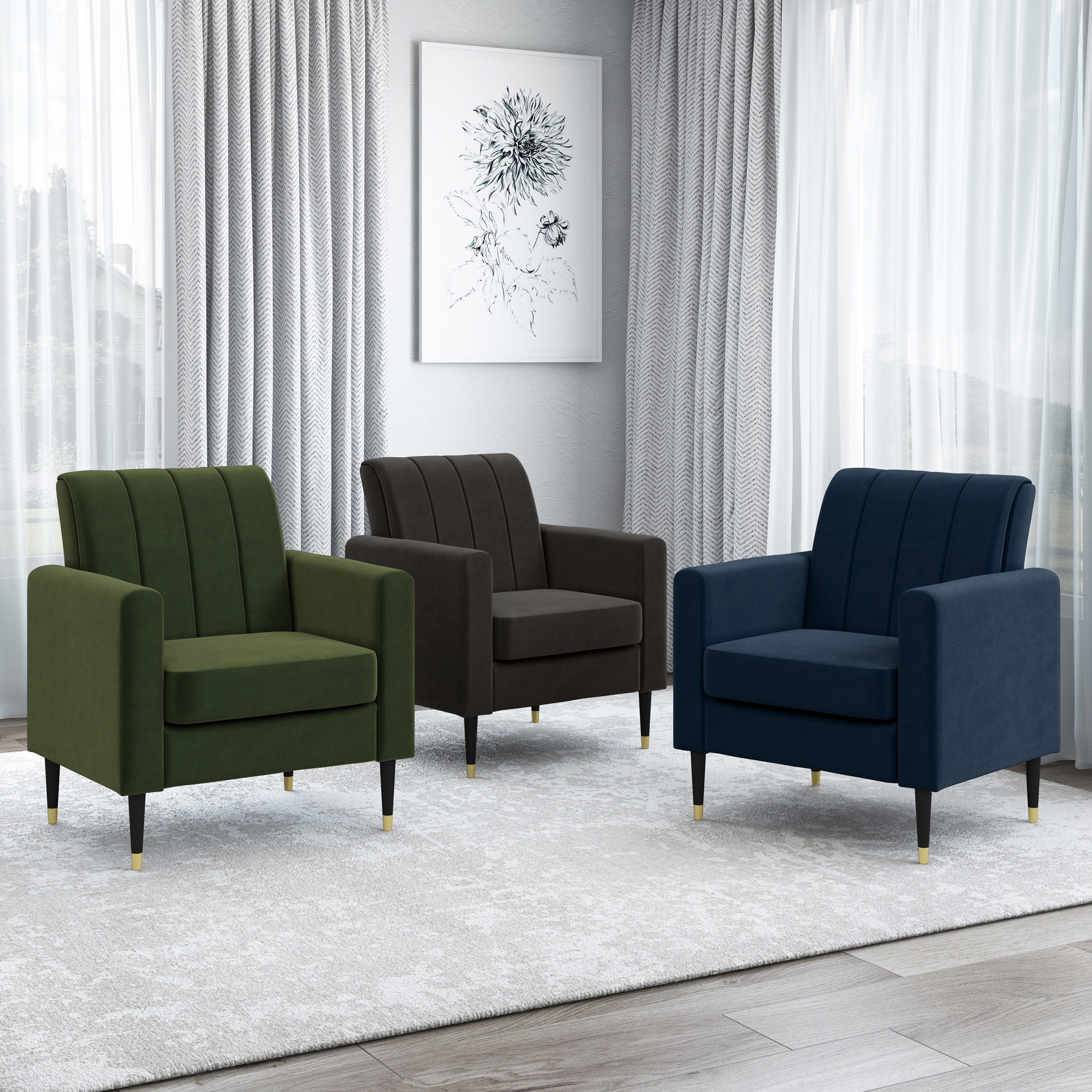 Product Label Upholstered in soft-to-the-touch velvet-like fabric, this armchair takes its design inspiration from mid-century modern style. It features a square, channel-tufted back and square arms for a neat, streamlined look. The removable cushion offers a soft seating surface. No tool slide and click assembly with included instructions.