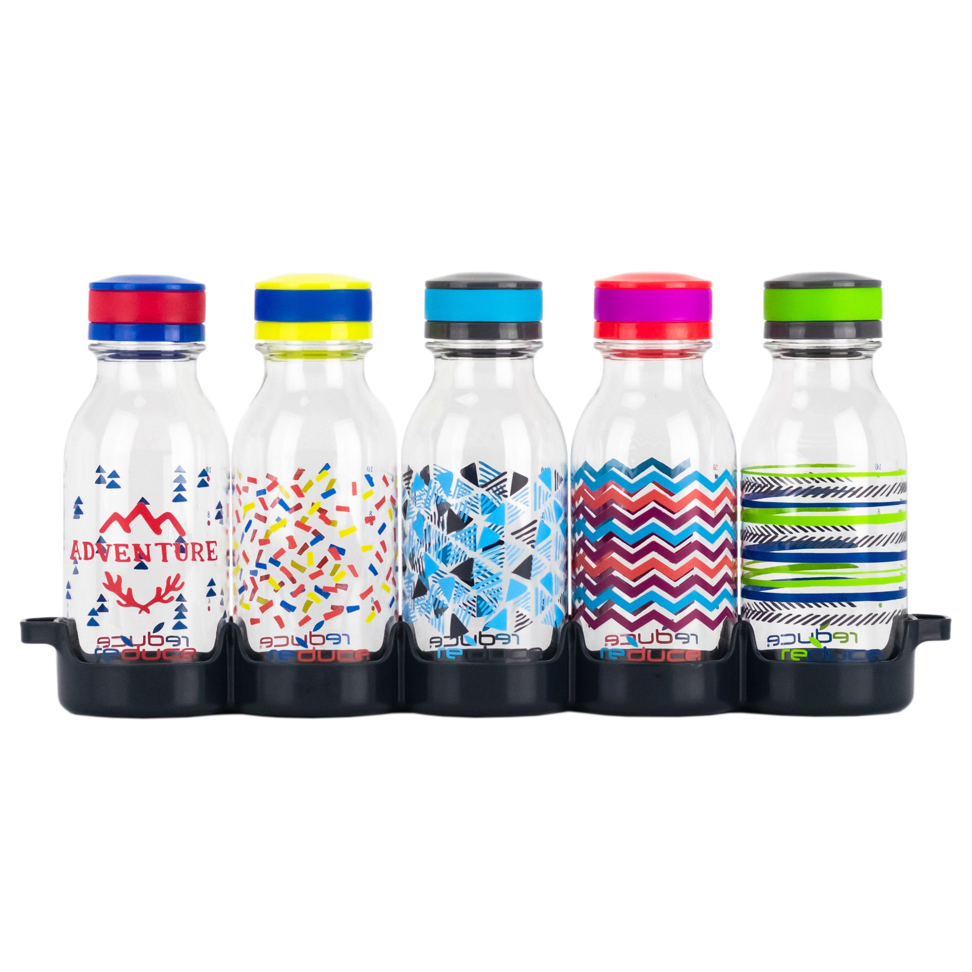 The Reduce WaterWeek set is designed to be a convenient way to ditch the disposables. With five re-useable bottles, busy mornings have never been easier. Just fill each bottle with your kids favorite juice or water, load them into their fridge tray, and grab and go as needed. More Convenience. Less Waste.Includes: