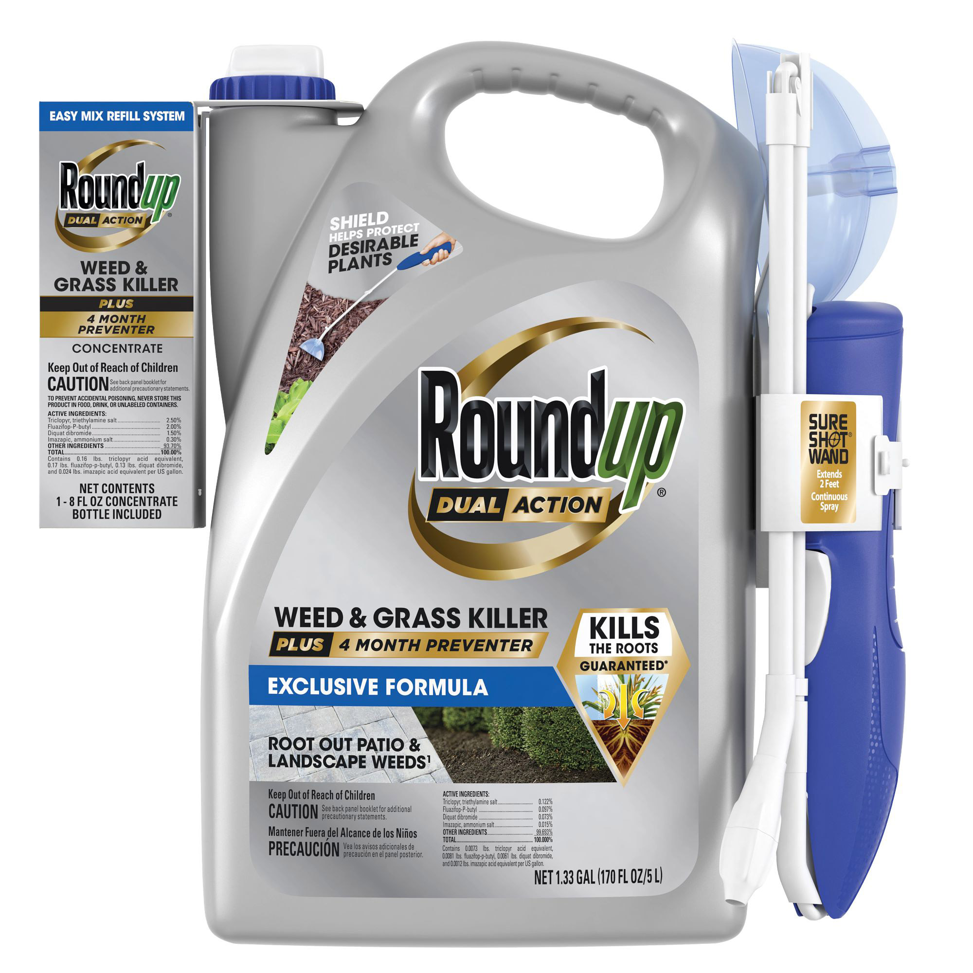 • The Easy Mix Refill system includes one 1.33 gal. container of Roundup® Dual Action Weed & Grass Killer Plus 4 Month Preventer with Sure Shot® Wand and one 8 oz. Roundup® Dual Action Weed & Grass Killer Plus 4 Month Preventer Concentrate.