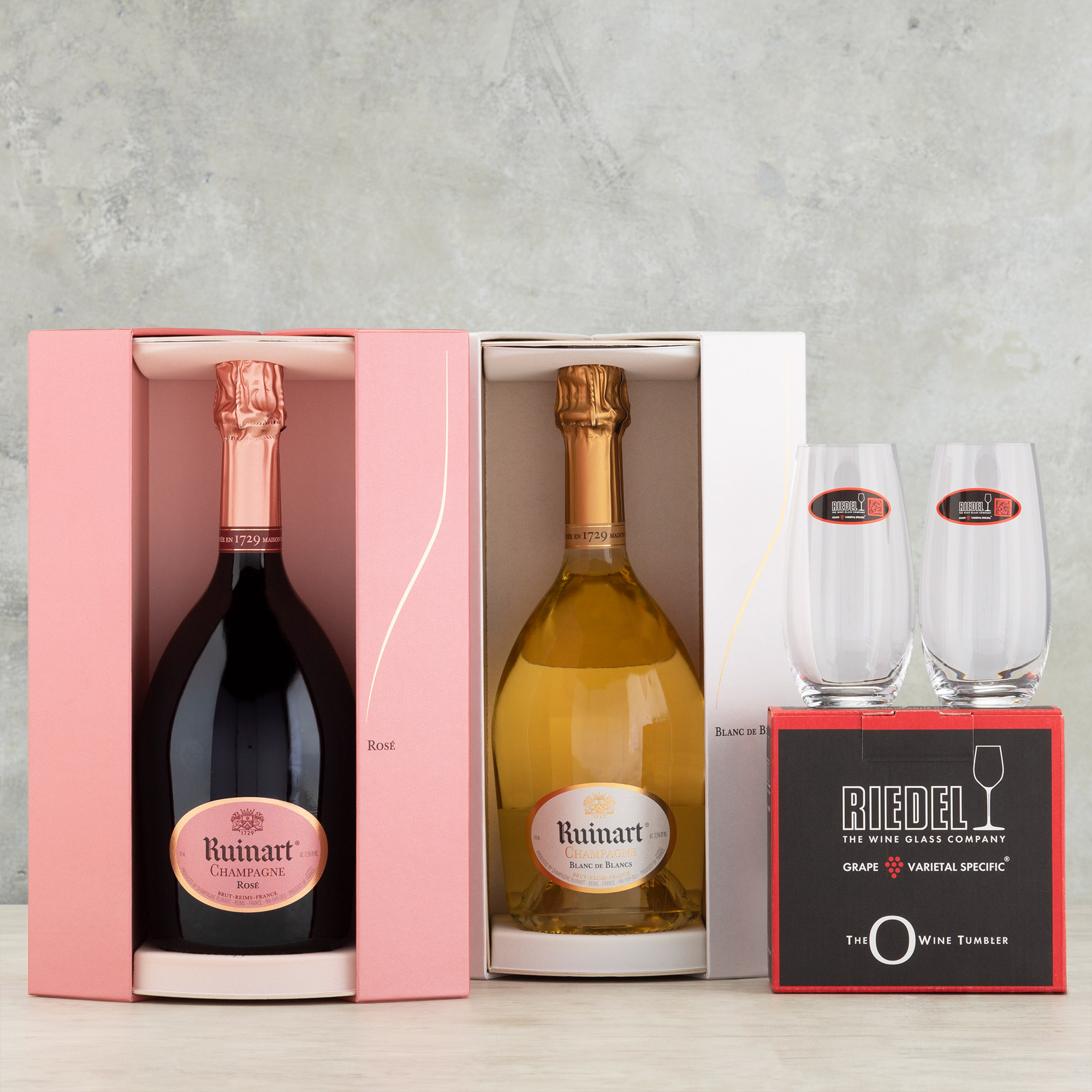 Two bottles of Champagne in one amazing gift! Ruinart Blanc De Blanc boasts fresh fruit notes of ripe citrus while Ruinart Rose tantalizes the pallet with complex flavors of tropical fruit and berries. Complete with two Riedel Stemless Champagne Glasses.