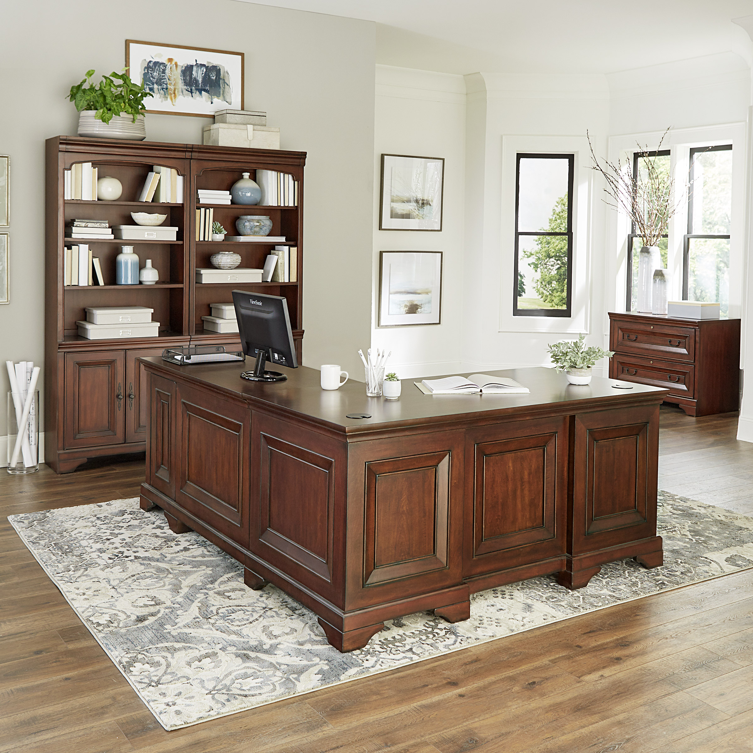 The Ryland Office couples a familiar look with modern day features to enhance the way that you work and stay organized. Traditional style elements including recessed panels, beaded drawer fronts, and shaped moldings create a look that is timeless and well respected. The Charleston brown finish features warm burgundy highlights and is applied over Cherry veneers and accented with worn pewter finished hardware. The combination of timeless design, quality construction and features makes Ryland the perfect choice for nearly any home or office.
