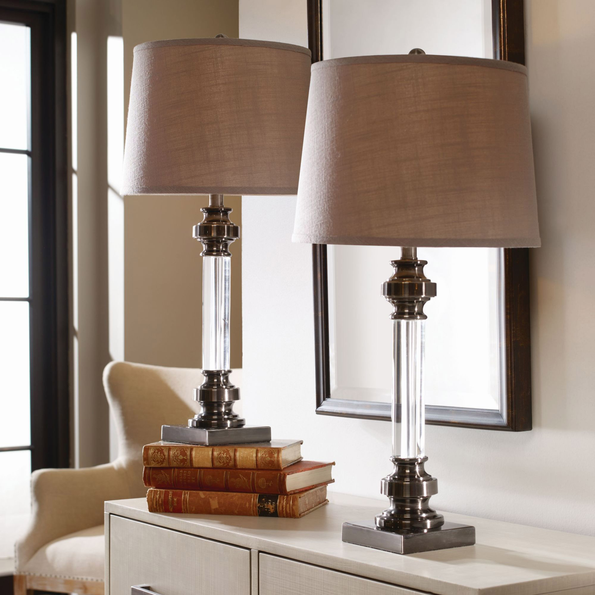 Pair of table lamps that offer a sophisticated look to any room. The clear column is paired with black nickel finish metal details. A stylish lighting option for your décor. Features: