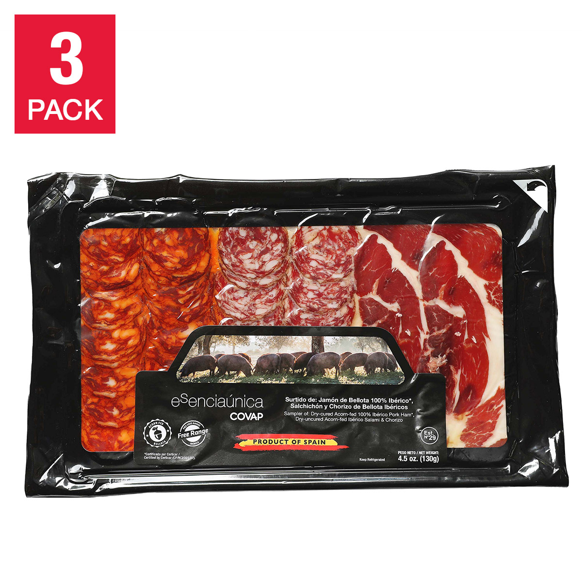 The Esenciaúnica Sampler of Sliced Ibérico Pork Products is a selection of the most exquisite flavors – Dry-cured Acorn-fed 100% Ibérico Pork Ham, Dry-uncured Acorn-fed Ibérico Salami and Dry-uncured Acorn-fed Ibérico Chorizo.
