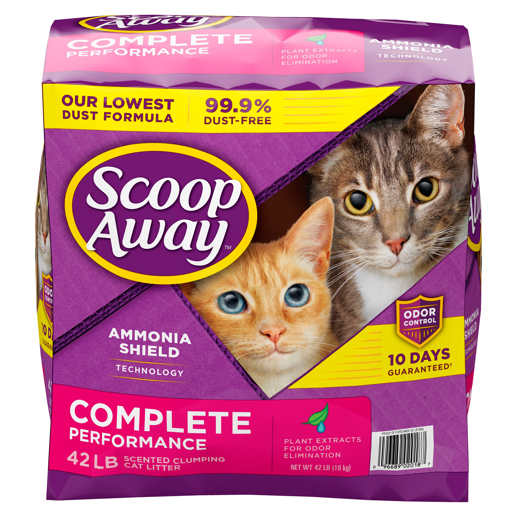 Scoop Away Complete Performance Scoopable Cat Litter destroys even the worst cat litter box odors, leaving behind a fresh clean scent. It's specially formulated to handle odors in even the busiest litter boxes and contains plant extracts for natural odor elimination for 10 days guaranteed. The tight-clumping formula leaves virtually no stinky crumbles after scooping. With the low dust formula and 80% less packaging than pails, cleaning your cats litter box is now fast and easy. To refresh and maintain the litter box, scoop daily and top off with fresh cat litter. Scoop Away Complete Performance Scented Cat Litter makes litter box maintenance easy.