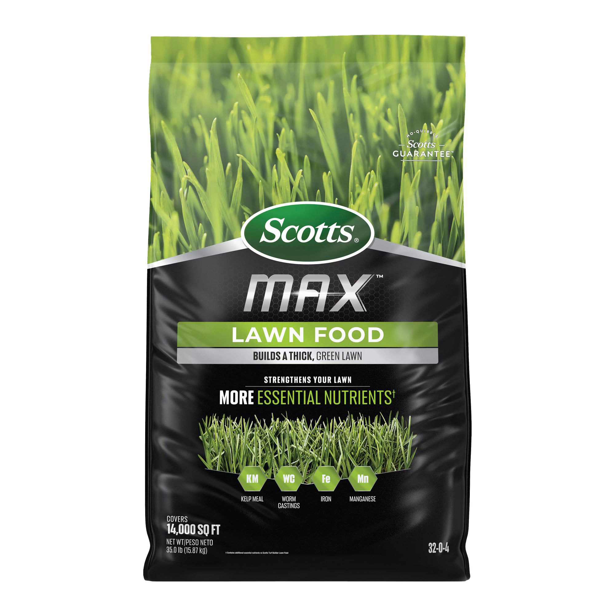 Scotts® MAX™ Lawn Food feeds to strengthen your lawn to help protect against future problems. Regular feeding builds strong, deep roots and improves the lawn's ability to absorb water and nutrients (vs. an unfed lawn). In addition, this fertilizer strengthens your lawn with more essential nutrients versus Scotts® Turf Builder® Lawn Food, including kelp meal, worm castings, iron, and manganese. Scotts® MAX™ Lawn Food works on any grass type. Apply to a wet or dry lawn during the growing season. We recommend using a Scotts® spreader to apply this product. For Scotts® broadcast/rotary spreader, using a setting of 3. For Scotts® drop spreader, use a setting of 6 ½. For Scotts® Wizz® spreader, use a setting of 3 ¾. For fast results, lightly water in. Apply this product 2 to 4 time annually in the spring, summer, or fall. The second application can be applied after 6 weeks. One 35 lb. bag of Scotts® MAX™ Lawn Food covers 14,000 sq. ft.