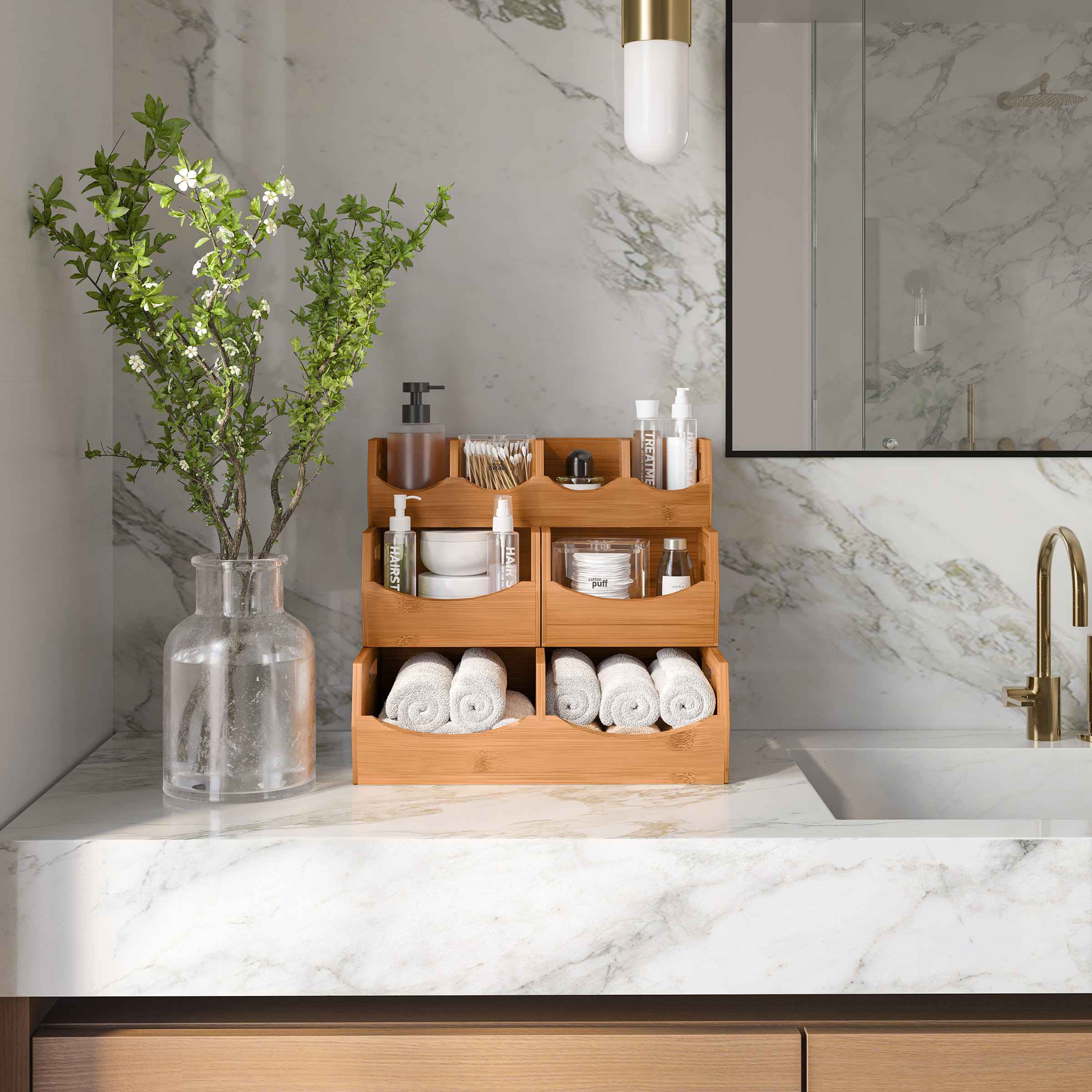 Make the most out of your space with Seville Classics 4-piece Bamboo Stackable Bin Organizer. The wide-open front design provides easy access to items, for a quick and seamless experience. Walls and frames are constructed of a lightweight durable bamboo material bringing a natural essence to your home. Two dividers included to customize space within the small bin, so your organization needs are not limited.