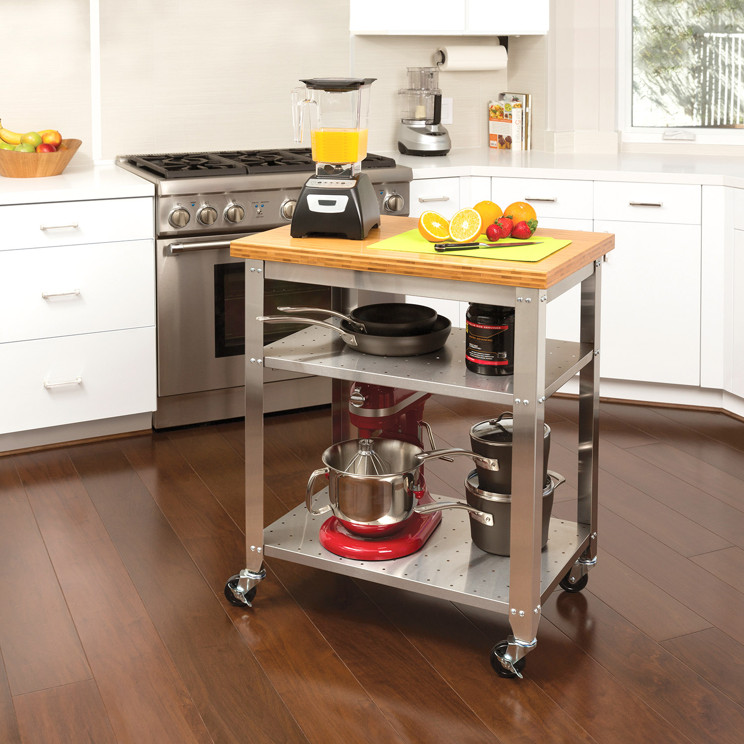 This item may currently be stocked at your local warehouseCreate an instant island in your kitchen with this versatile Stainless Steel Prep Table by Seville Classics. The durable 1.5" cross-laminated bamboo top is perfect for any kitchen activity. Simply add your favorite cutting mat or bowl for slicing, dicing, mixing, or mingling. The stainless steel frame has an upscale look that will surely compliment the decor of any home. Featuring industrial-strength casters, this cart provides convenient transportation from the kitchen to the dining room, den, or any room in your home. Securely lock your cart in place, creating an instant workstation for crafting or home projects. Two spacious stainless steel shelves provide additional storage space for small appliances and an array of food preparation tools. Be inspired to let your inner chef enjoy the extra workspace you need!Features: