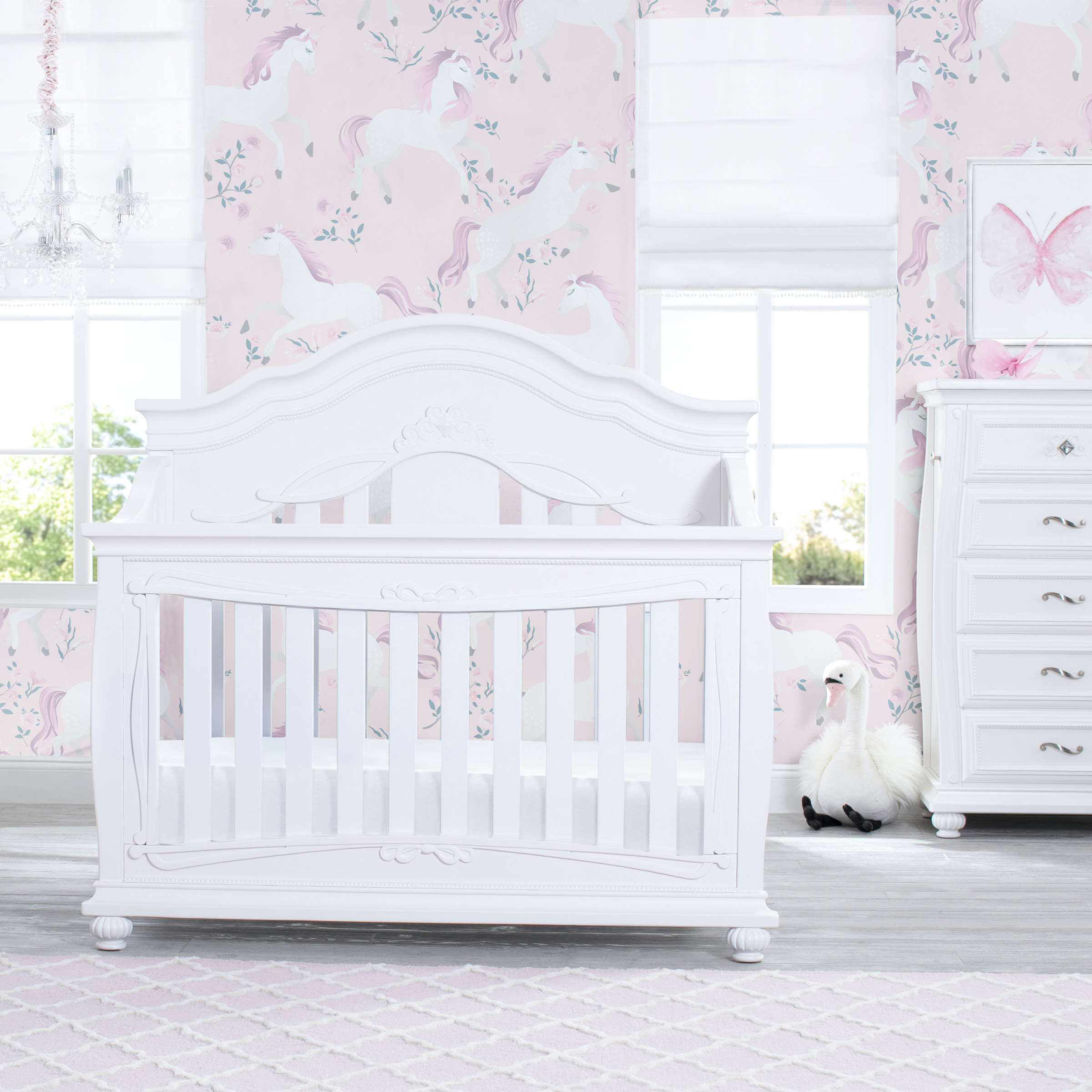 Give your nursery the royal treatment with the Ariel Convertible Crib by Simmons Kids. Full of enchanting details, like a scalloped silhouette, intricate princess-inspired carvings and bun feet, this nursery collection adds sophisticated style to any bedroom. Designed to grow with your little princess, the crib features three adjustable mattress positions, and (magically!) transforms into a toddler bed, daybed, sofa and full-size bed. For your convenience, all the conversion rails are included with this crib to easily allow you to adapt to each stage of your child’s life. The 5-Drawer Chest will be the crown jewel of any bedroom. Its exaggerated silhouette features curves inspired by the classic bombé shape for a whimsical touch, while intricate carvings and bun feet balance the look. Five sliding drawers with swirl-shaped satin nickel pulls open to reveal a wealth of storage within. Acrylic knobs on each side of the chest provide additional storage space to hang accessories, like necklaces or headbands.