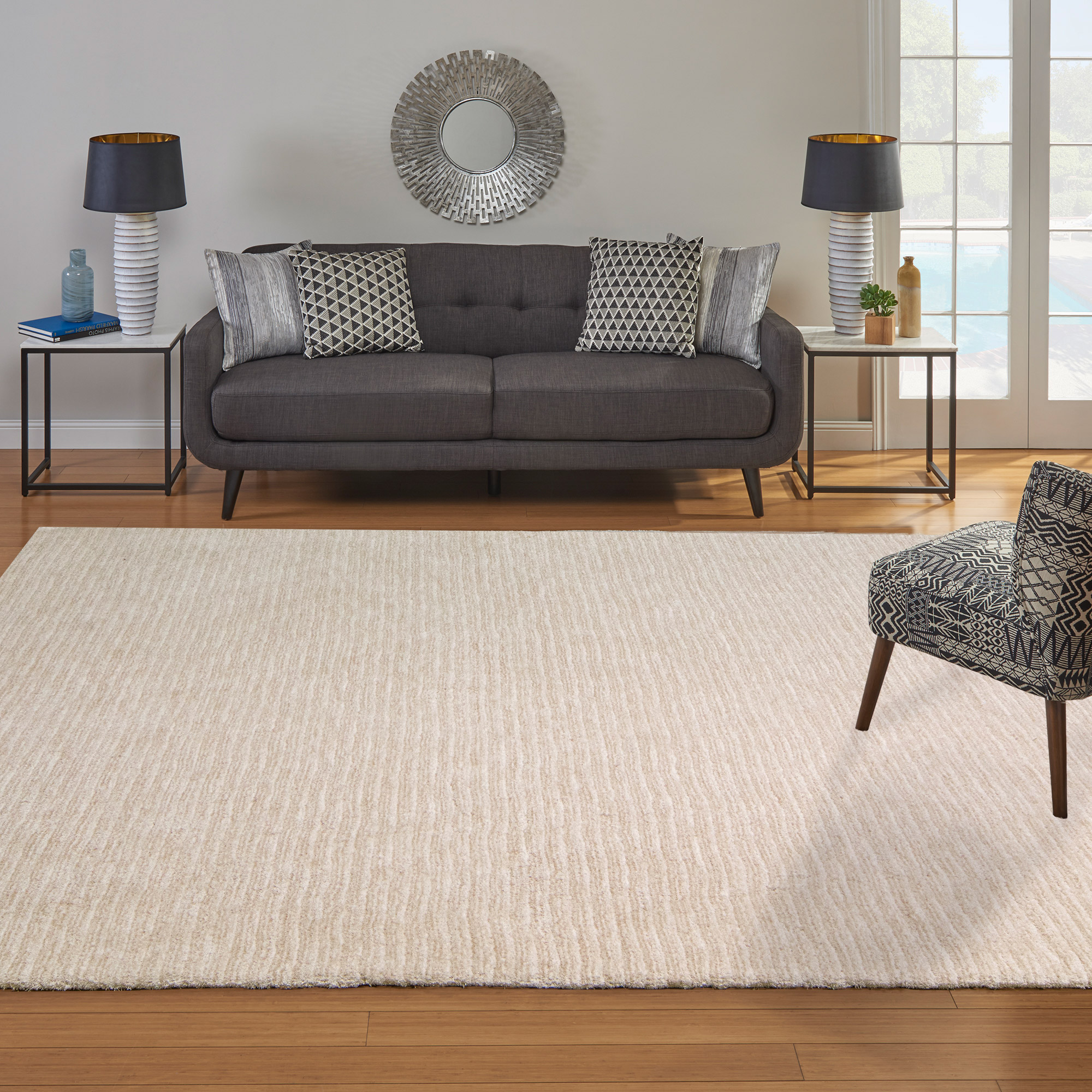 Item may be available in your local warehouse for a lower, non-delivered price.Velvety soft, finished edges, and glowing colors, the Soft Step Shag Rug sets a new standard for upscale elegance. The machine tufted construction and densely packed microfiber yarn ensures strength and durability.Elegant and understated stripes of cream to tan yarns make the base of the rug.Features: