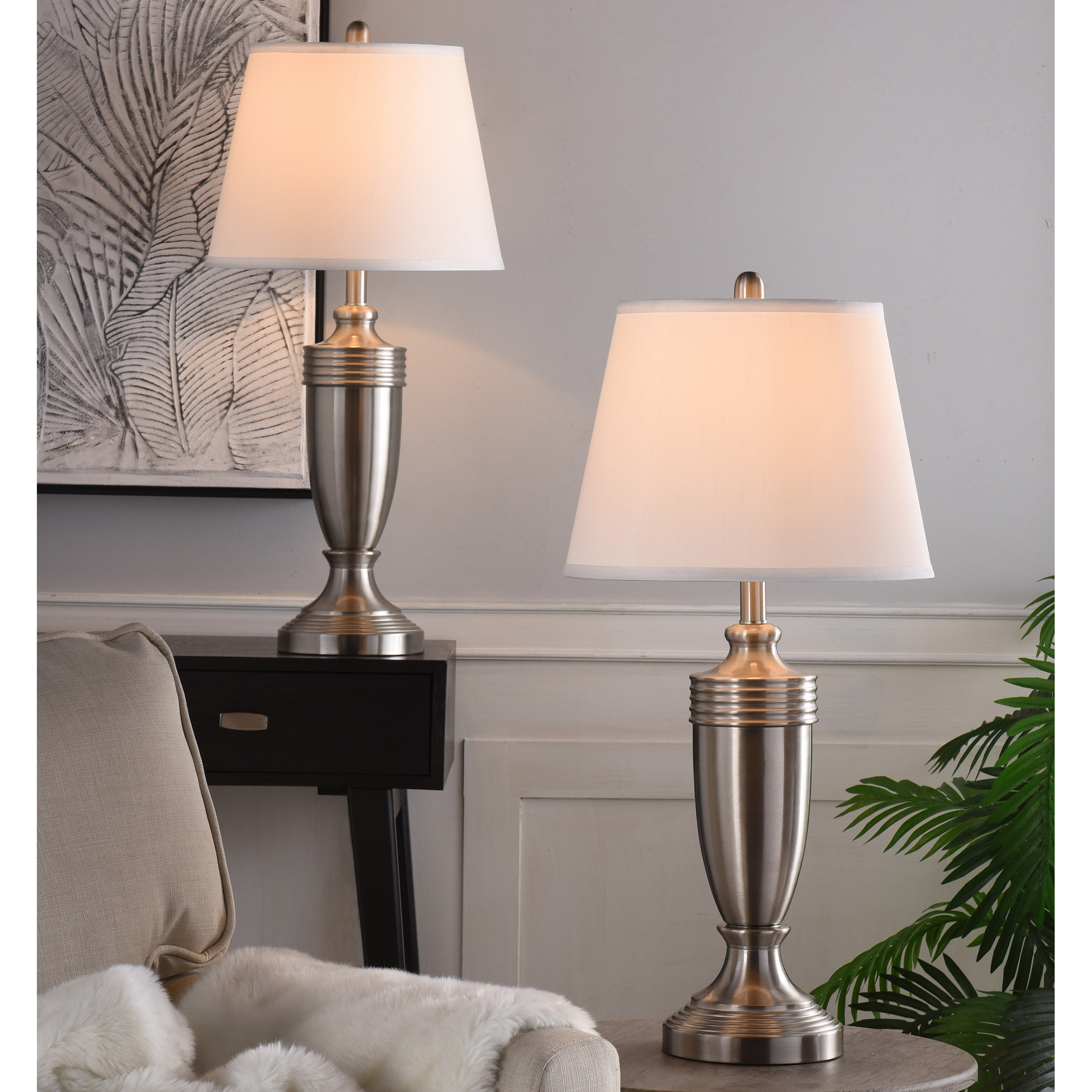 Ideal for most décor types, this pair of Solaro steel table lamps features a classic urn shape with updated horizontal ribbing and brushed steel finish. This set of 2 lamps are topped with 10.5” tall white hardback empire shades and come with matching finials and 1 LED bulb for each lamp (total 2).