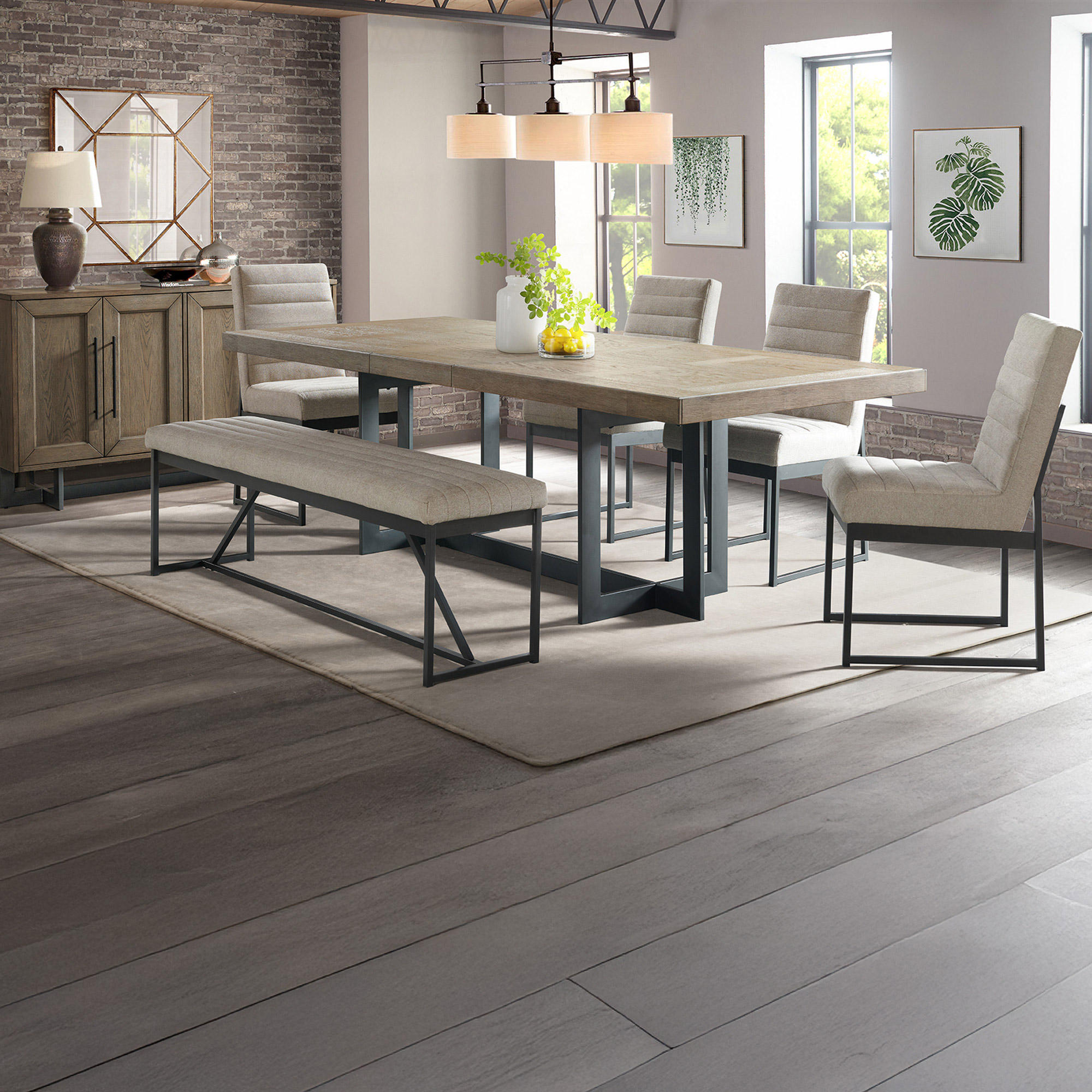 Product Label The Stone Harbor Dining Collection is constructed of Rubberwood and Poplar solids with an Oak veneer. This set features a wire brushed urban rustic dune Brown finish. This unique industrial dining collection offers a modern style, designed for ultimate comfort. A self-storing leaf and cable driven metal slides provide functionality for day to day use. Coordinating upholstered side chairs and bench have a metal base.