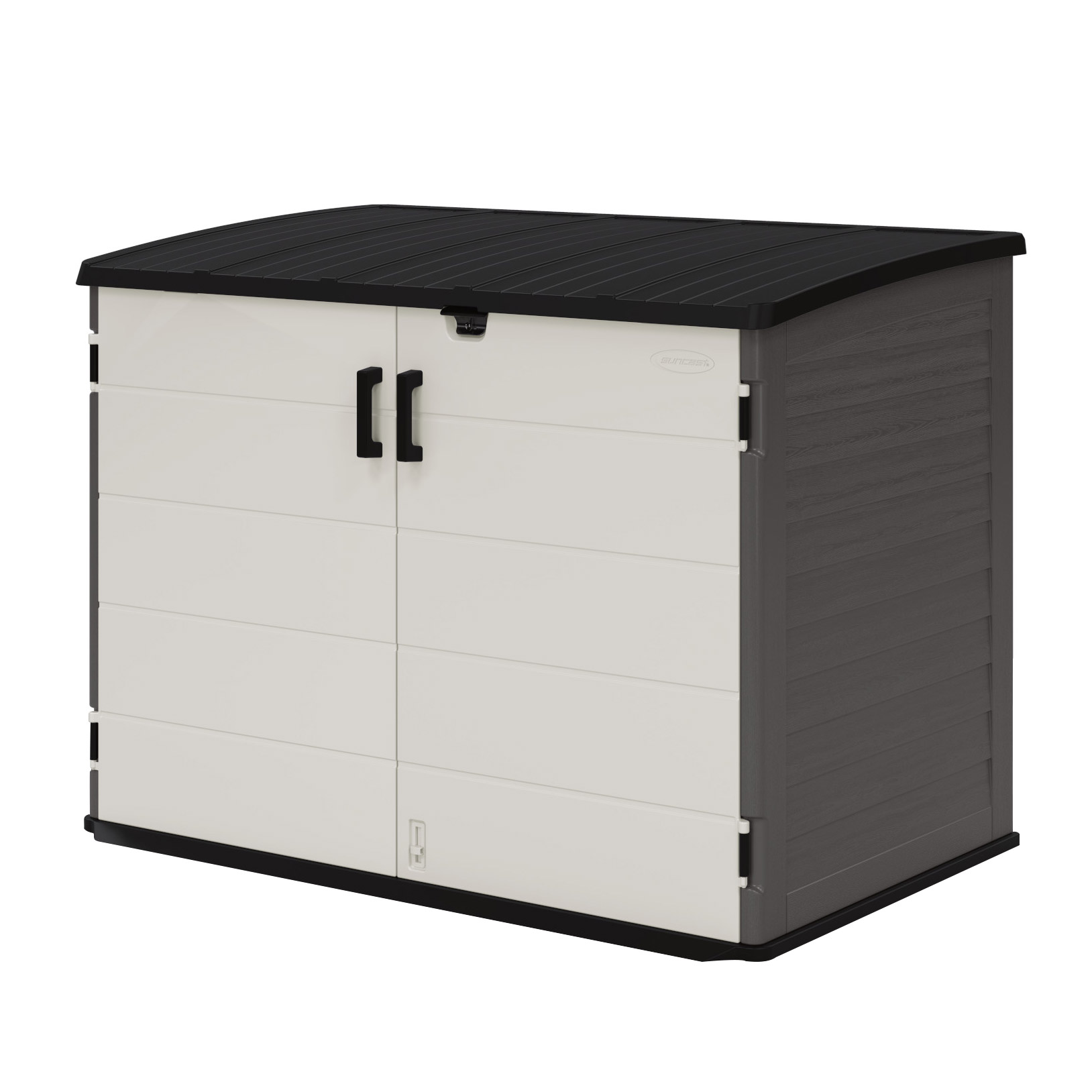 At 70 cu. ft., this Horizontal Shed by Suncast is the perfect solution for hiding your unsightly garbage cans and organizing your lawn and garden equipment. The storage space is sufficient for holding up to two – 96-gallon waste containers or it can house other items such as furniture cushions, bicycles, firewood, and gardening supplies. Two front-opening doors along with the top-loading lid allow easy access to your items. Gas shocks assist for a one-handed lift operation and ensures that the lid will stay open while in use. Additionally, this horizontal shed has a soft-close hinge that is designed to prevent the lid from closing too quickly or slamming shut. Constructed of steel-reinforced, multi-wall resin, this durable shed is built to withstand the elements throughout any season.
