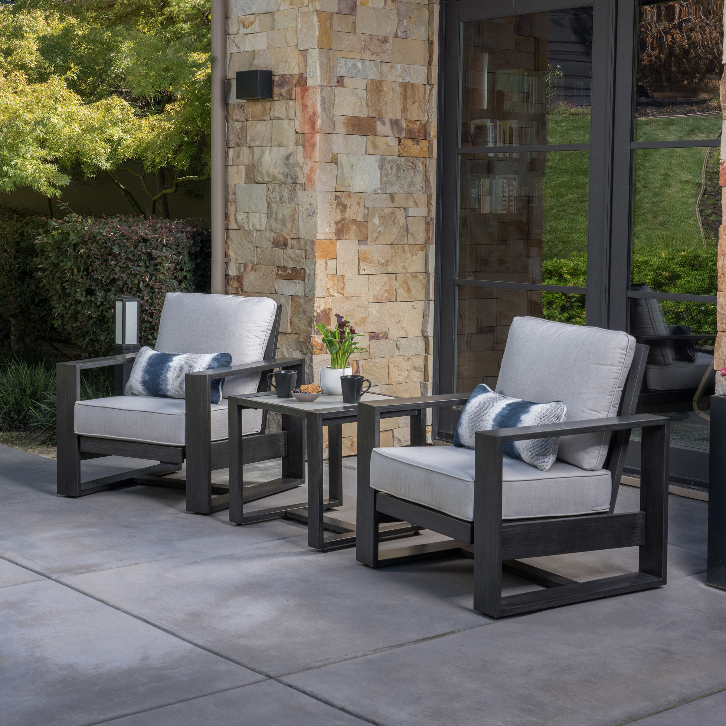 - Includes Two Motion Lounge Chairs, One Table, and Two Lumbar Pillows