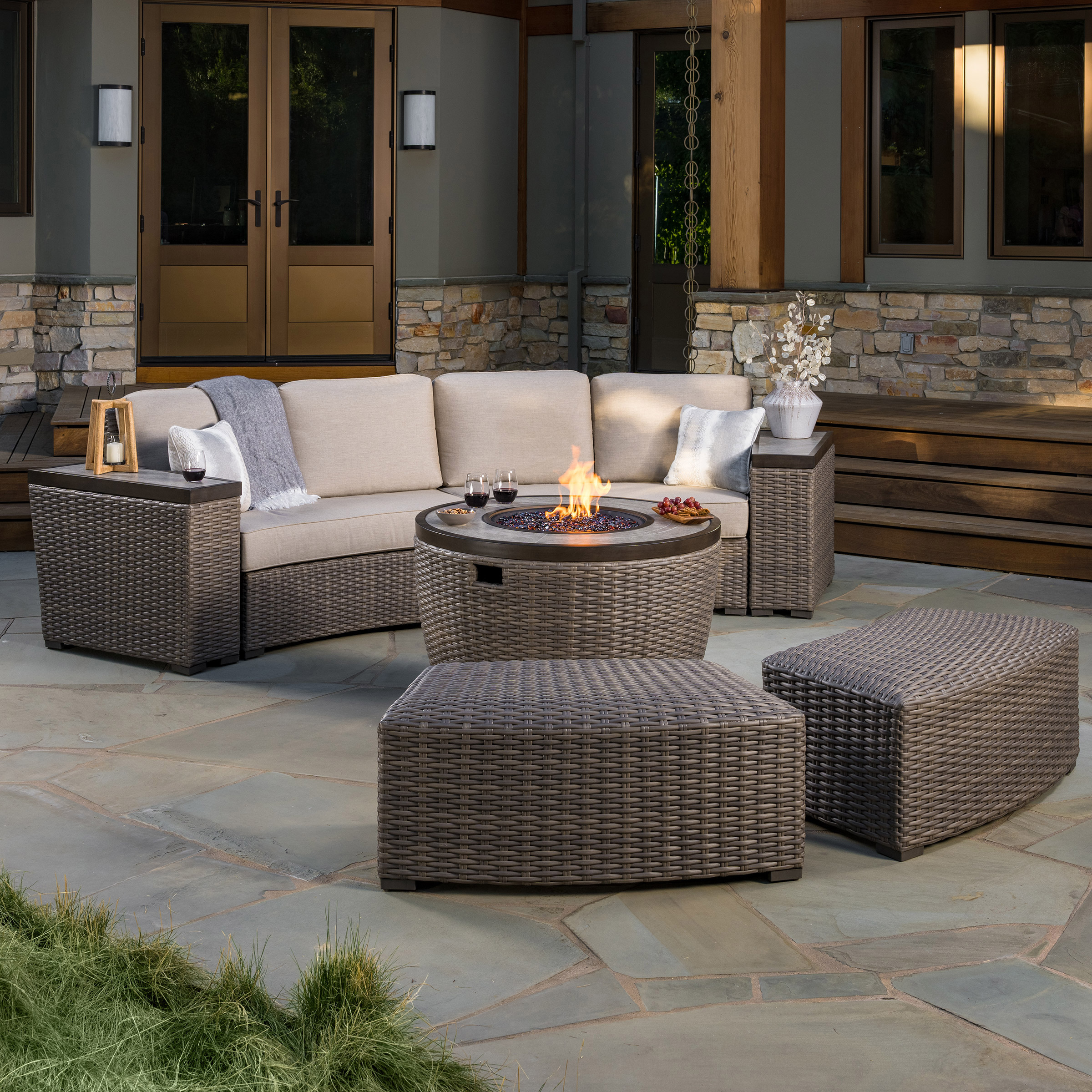 - Includes Two Curved Loveseats, Two Curved Ottomans, Two Wedge Tables, One 38” Fire Table