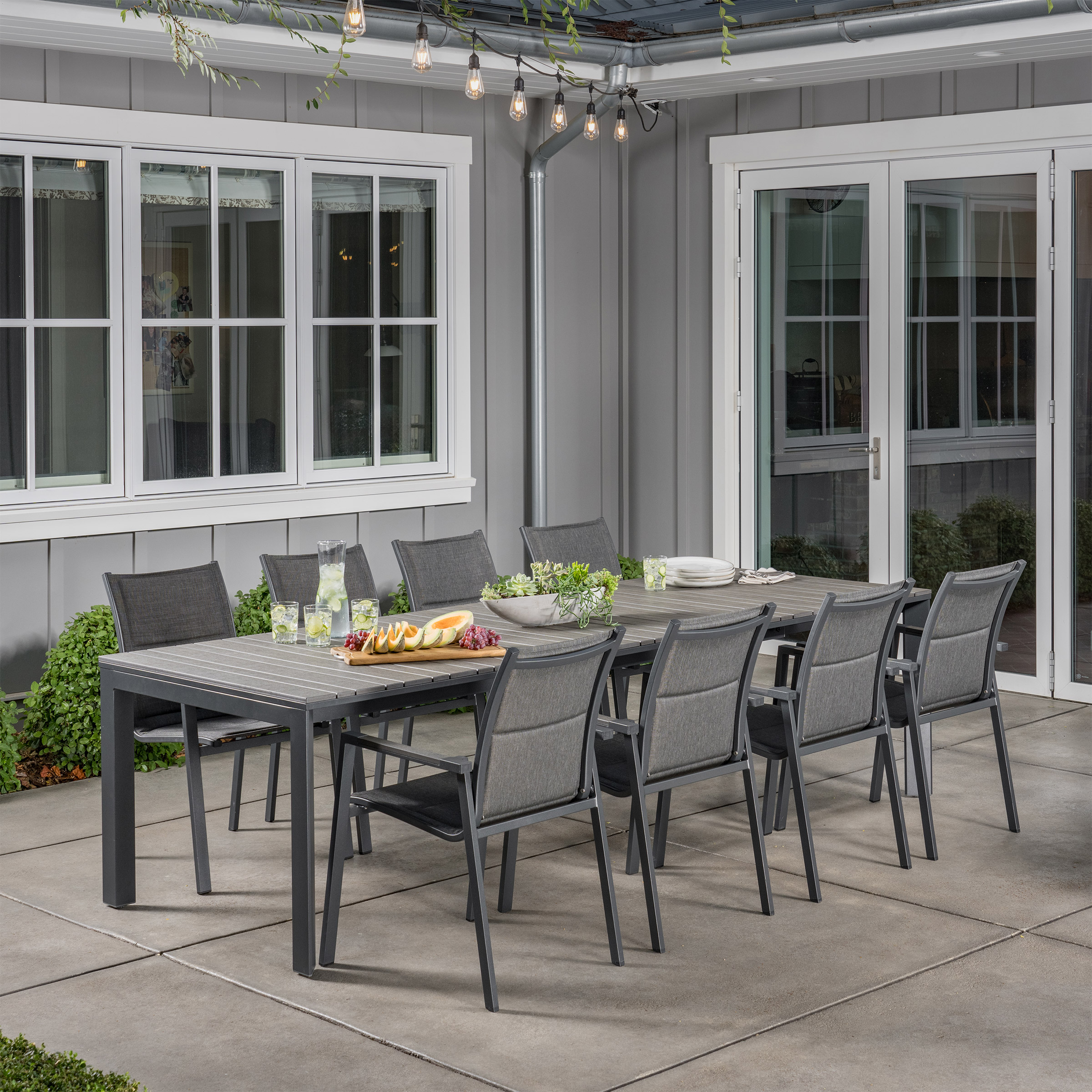 • Includes Eight Padded Stackable Sling Dining Chairs, One Expanding Dining Table, and Furniture Cover