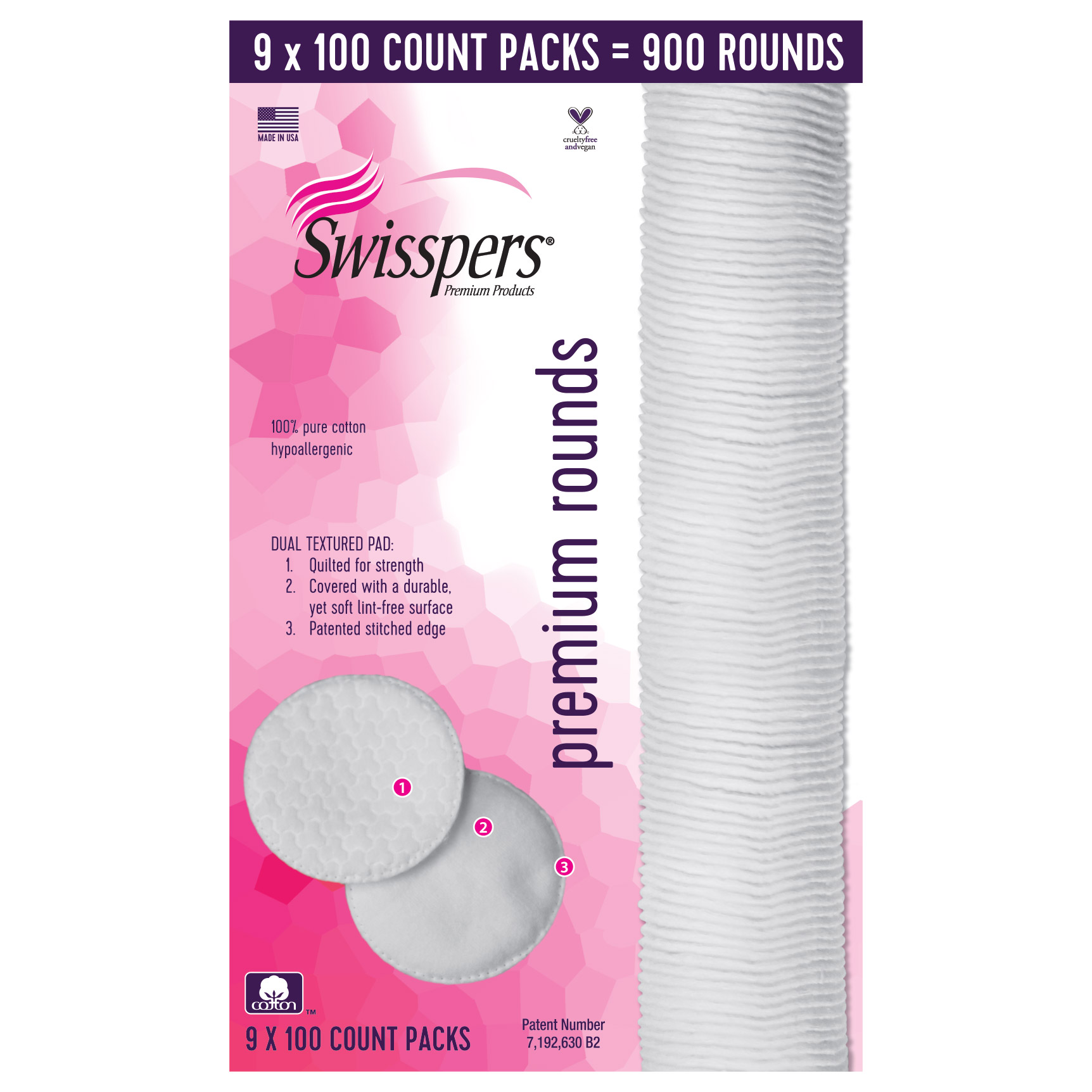 Swisspers hypoallergenic cotton rounds are made with 100% cotton and are gentle enough for all skin types.The dual sided, multi-layer design creates a soft, yet strong lint-free cotton round.Perfect for removing makeup and nail polish or applying your favorite skincare products.Our patented stitched edge design binds all layers together to ensure a durable pad that will not separate during use.Plush 100% cotton core provides the ideal softness, absorbency and thickness for our premium cotton rounds.