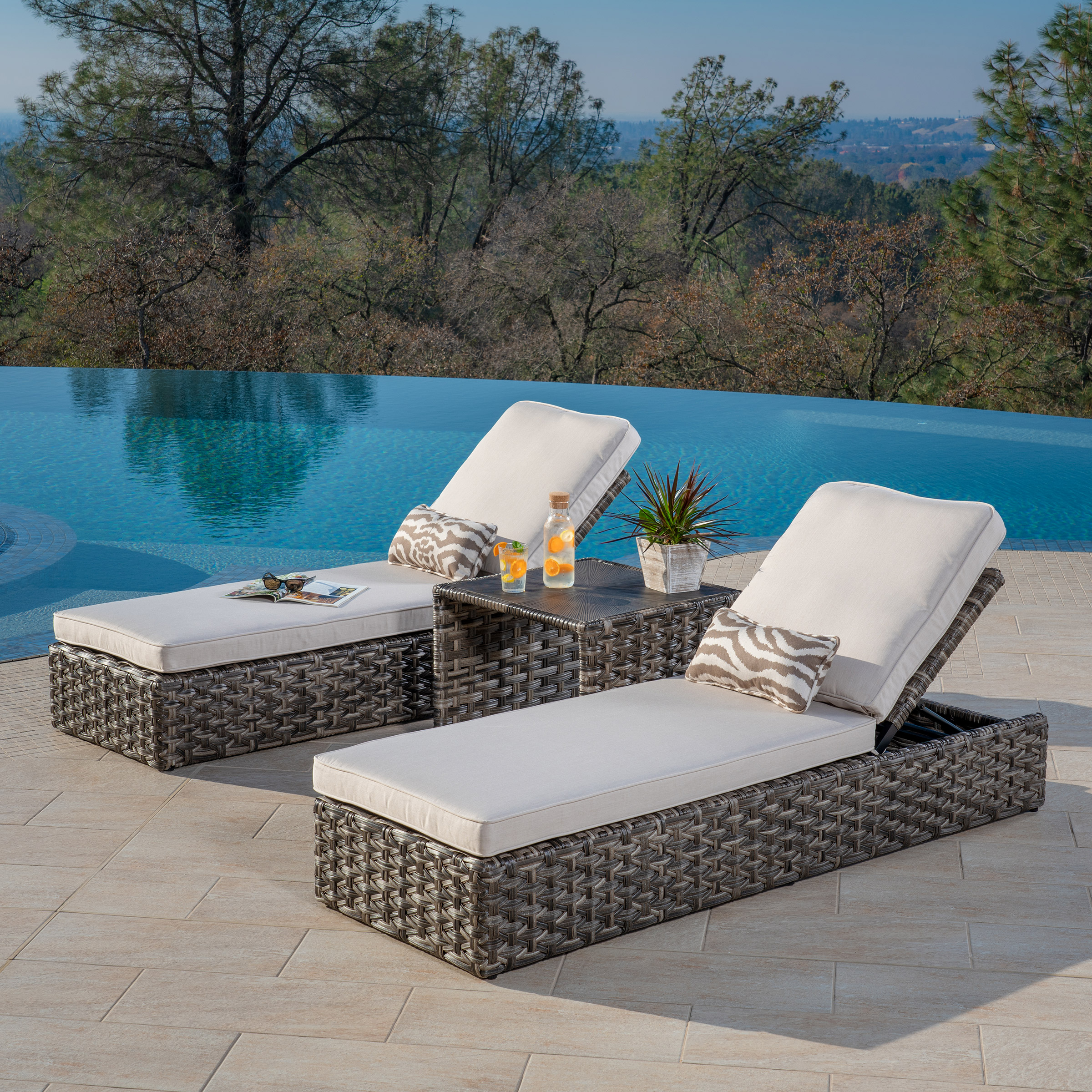 Trendy in design and function, the beautiful Terra Mar 3-piece Chaise Set is a smart choice for relaxing by any poolside or outdoor space Hand-woven in resin, all-weather wicker, this sturdy and durable chaise set comfortably supports 2 adults on cushions covered in all-weather, made-in-the-USA Sunbrella® fabric. The Terra Mar side table is situated at the perfect height for a quick sit or a lengthy lounge. The Terra Mar Chaise has an easy to operate, 5-position backrest that provides for the perfect angle to catch the sun or read a book. Rooted in versatile, contemporary styling and grounded with trusted Veranda Classics ™quality, Terra Mar welcomes you outdoors.