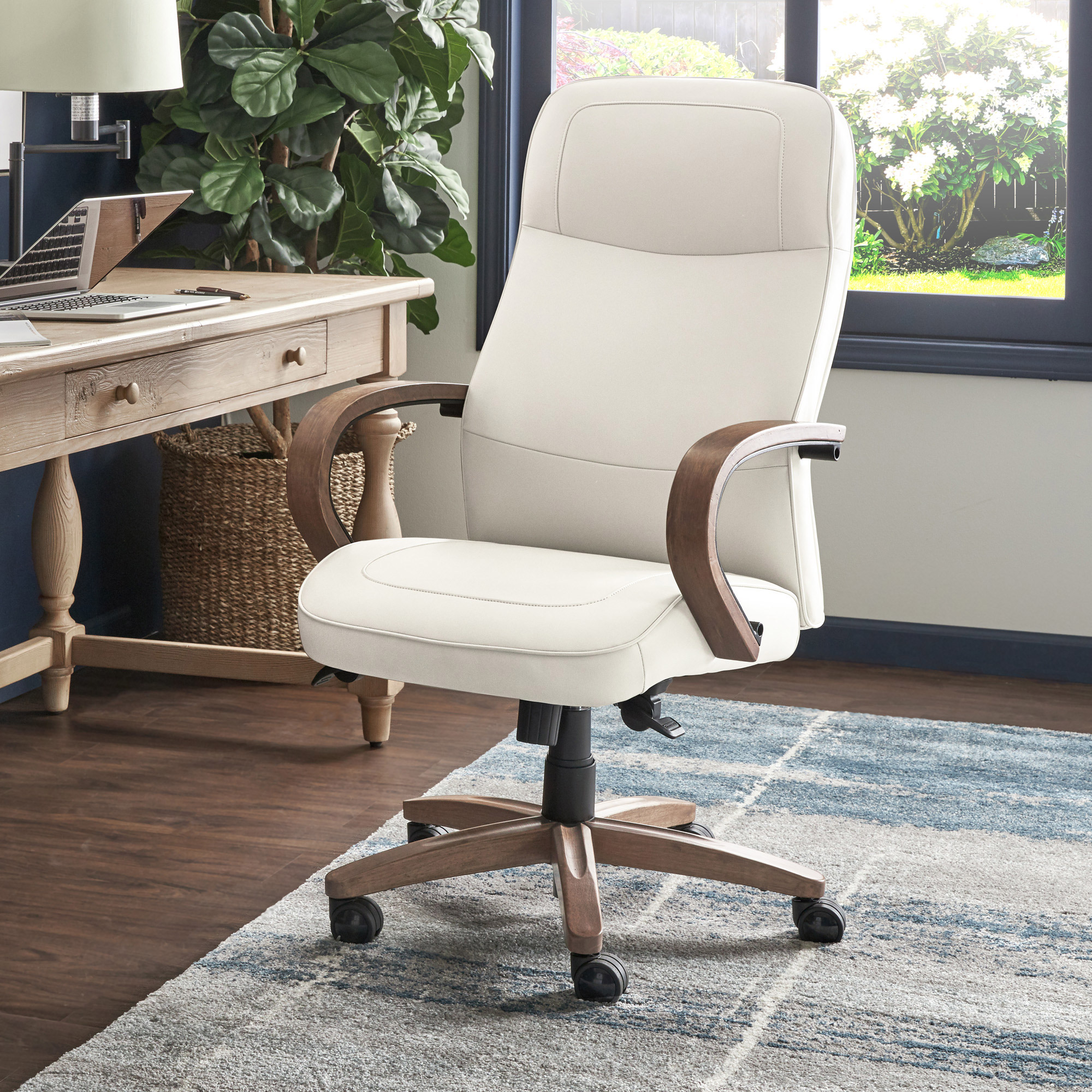 Product Label Dedication to craftsmanship, reliability, and timeless design has been the Thomasville standard for over 100 years. This deep-rooted heritage of excellence is on full display with the Thomasville Lockhart Executive Chair. A tall contoured back, bonded leather and rich wood details combine to create a truly timeless piece. Ergonomic and adjustable, this modern desk chair allows you to control the height, tilt and lift for an optimized body alignment.