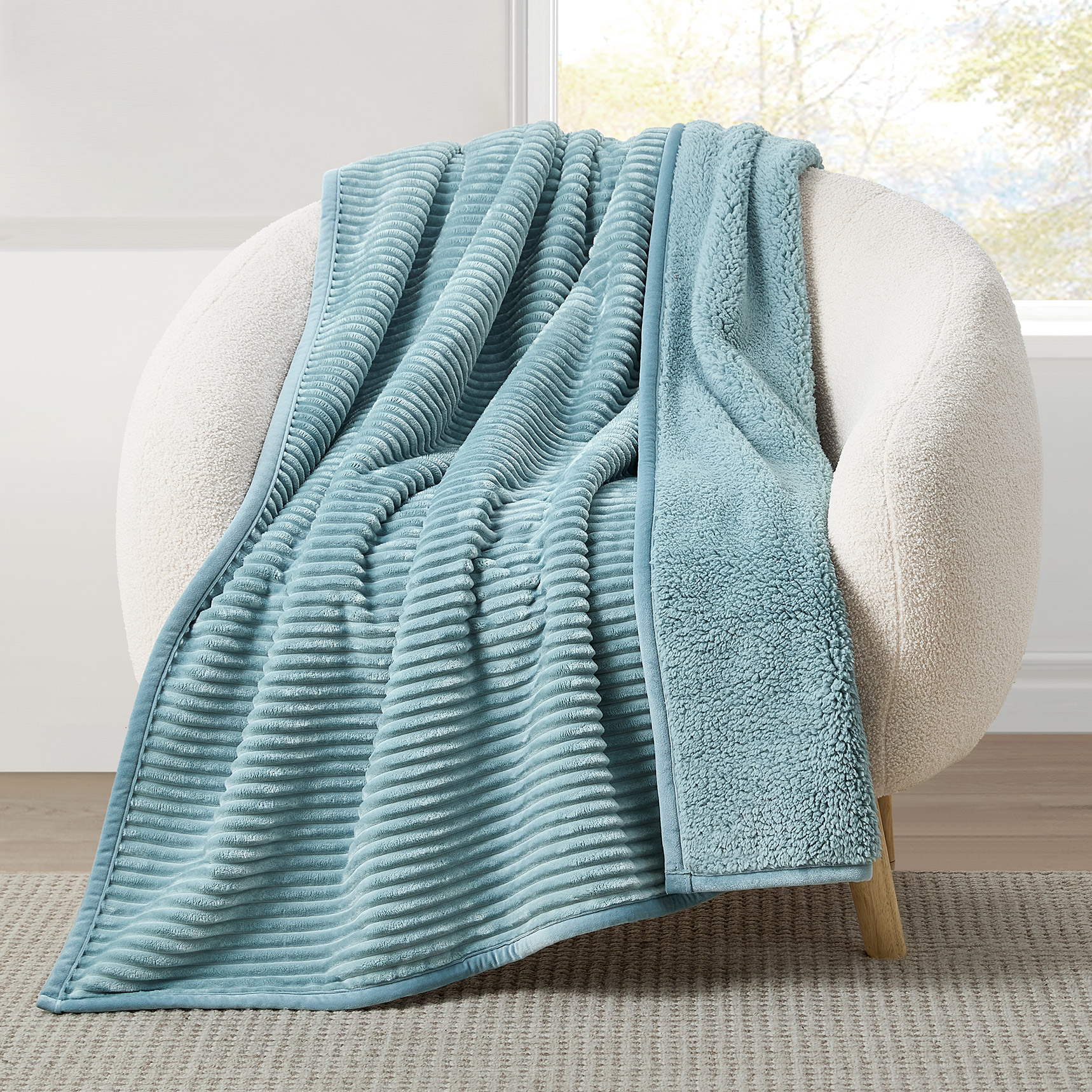 This soft throw features a ribbed textured design reversing to faux sherpa. This throw provides all-season warmth and comfort while adding a stylish touch to your space.