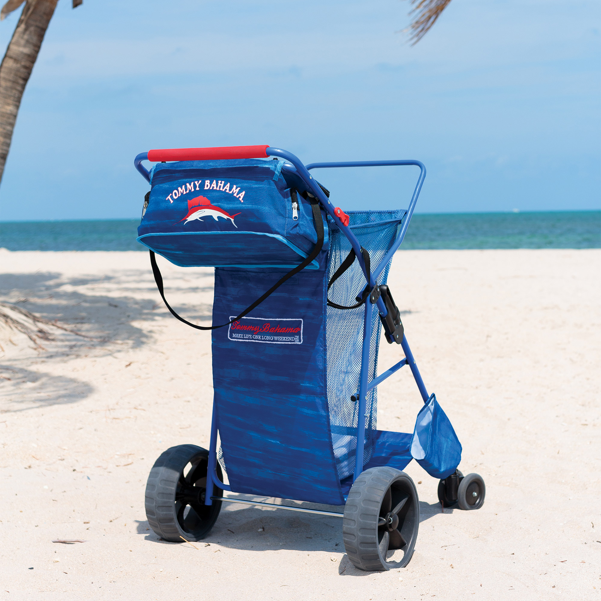 Item may be available in your local warehouse for a lower, non-delivered price.Get all your gear down to the beach in one easy trip with the Tommy Bahama Beach Cart. Designed to hold up to four beach chairs and a day's worth of amusements, this innovative cart combines the roomy utility of a wagon with the pushing ease of a multi terrain stroller. Removable, water-resistant, lined tote with Tommy Bahama logo is great for carrying snacks, games, lotions, towels, and more.Features: