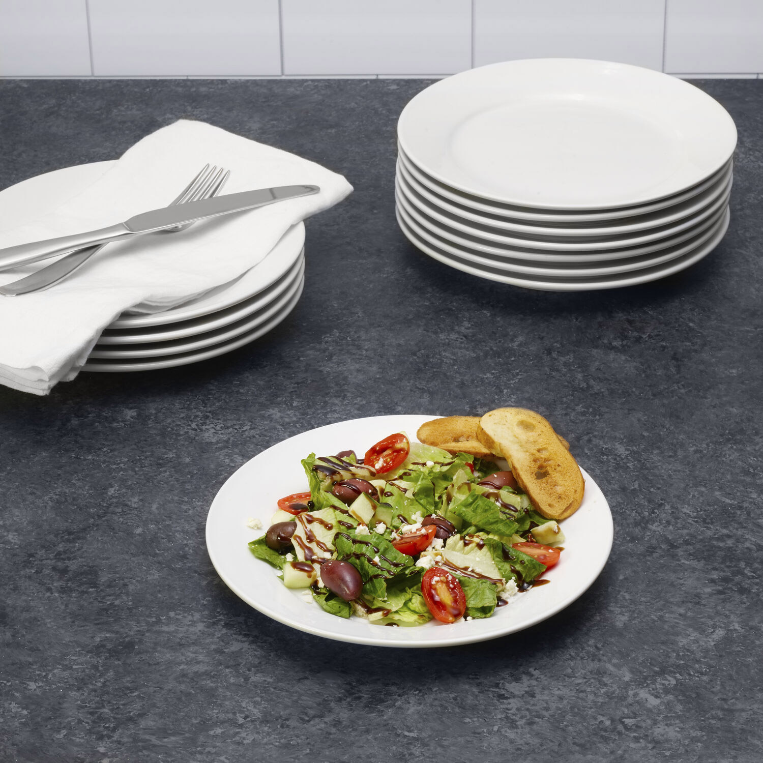 Ideal for both commercial and home use, this Towle Hospitality Set of 12 Porcelain Wide Rim Salad Plates ensures you always have enough plates on hand for larger gatherings. Designed to surpass the rigid requirements of the Food Service Industry, they are crafted of twice-fired porcelain, which is nonabsorbent to prevent harmful bacteria from forming. They are also thermal shock resistant, with rolled edges that provide long-lasting, chip-free use even in the busiest kitchens. The Bright white bodies coordinate with most white commercial dinnerware and complement any stemware or flatware. Set of 12 plates, each measuring 9 inches in diameter. Microwave, freezer, oven, heat lamp, refrigerator, and commercial dishwasher safe (including chemical or high heat).