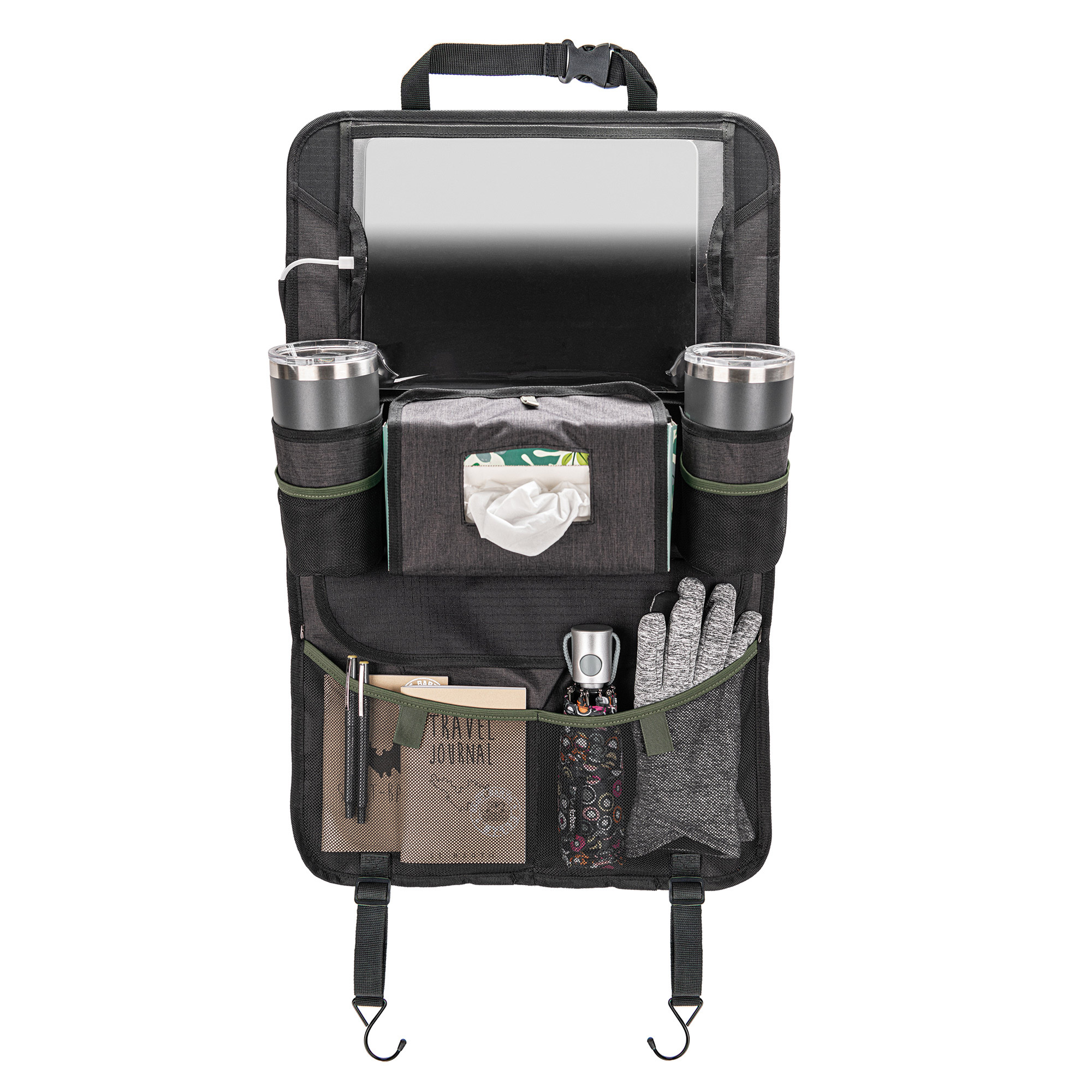 •  MAXIMIZE STORAGE AND ORGANIZATION | Two large drink holders, two mesh pockets, a large Velcro dump pocket, and slip pocket ensure that everything has a place behind your seat. Charging cable loops to keep your tablet/phone cords organized.