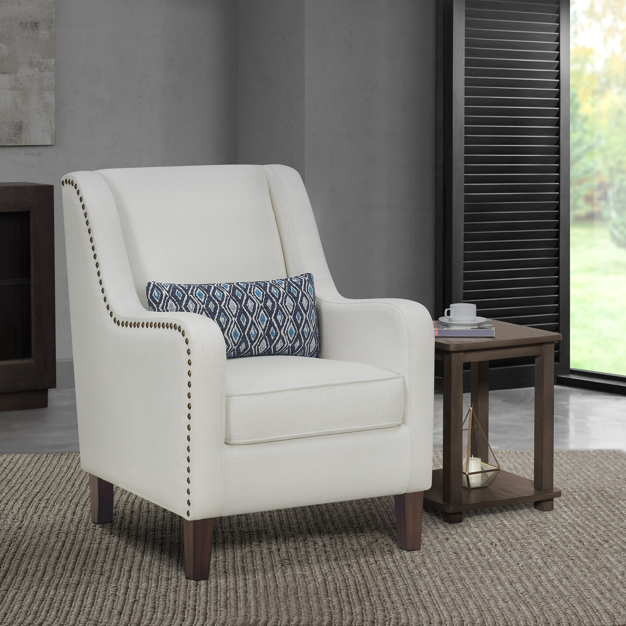 The TRUE Mila Accent Chair is a subtle node to a traditional concept that boasts updated design elements without compromising comfort. A slightly weaved fabric, composed of durable fibers, covers the silhouette of this chair making it the perfect backdrop for the patterned lumbar pillow to visually pop. The comfort of this chair goes beyond the plush pillow and into the seating construction due to a supportive no-sag spring system and pocket coils. Whether stationed in a corner space or serving as the main focal point, the nailhead arm trim will be admired from many angles. Solid wood legs, in a rich walnut brown finish, complete the frame.