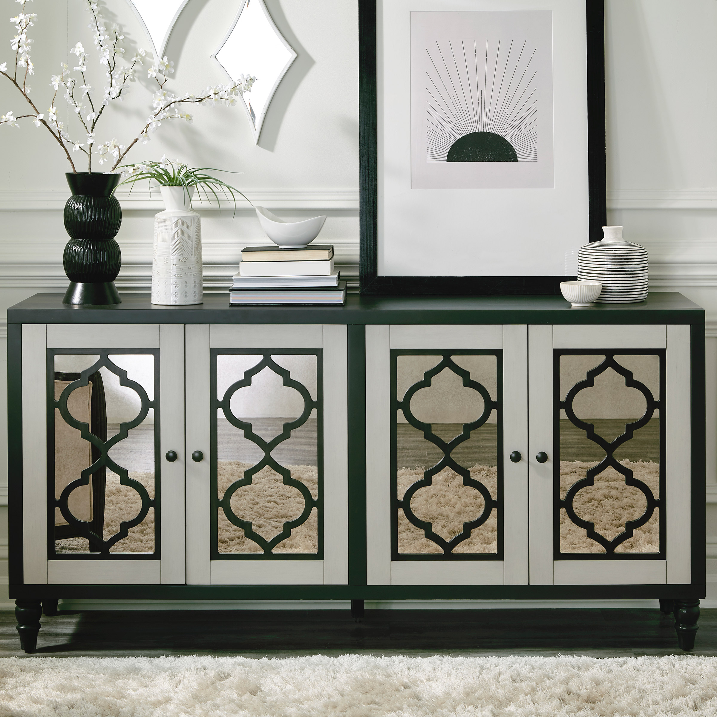 Refresh and revitalize any room in your home with the gorgeous Tyler Accent Console. Features a popular two-tone Charcoal and Ivory finish accentuated with matte black hardware that is sure to complement and enhance any style or decor. Four antiqued mirrored doors with quatrefoil design make this console a truly dramatic and unique accent piece. Two interior shelves add extra space for your storage needs. Quality crafted to ensure many years of use and enjoyment.