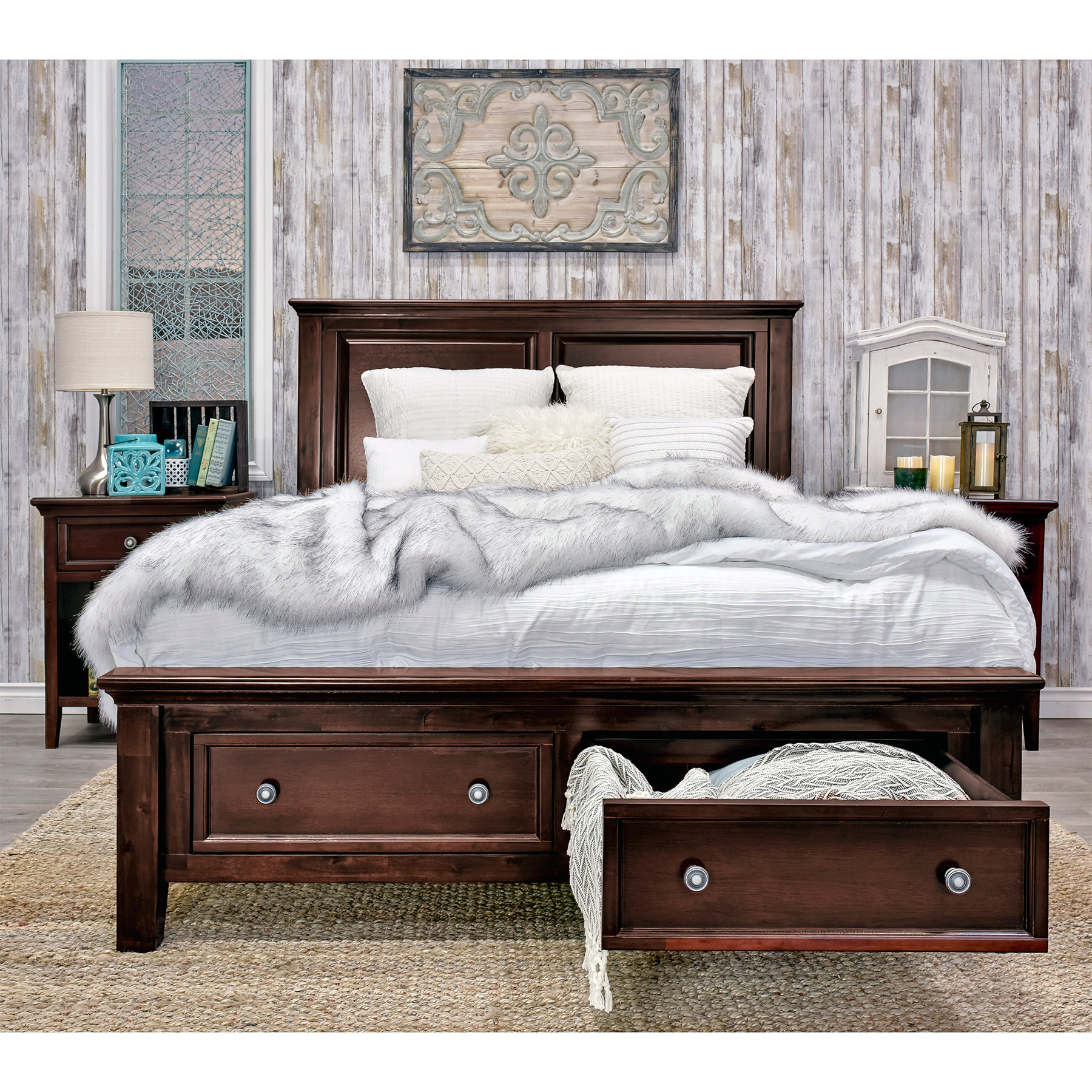 - Footboard includes two large solid wood pull-out storage drawers