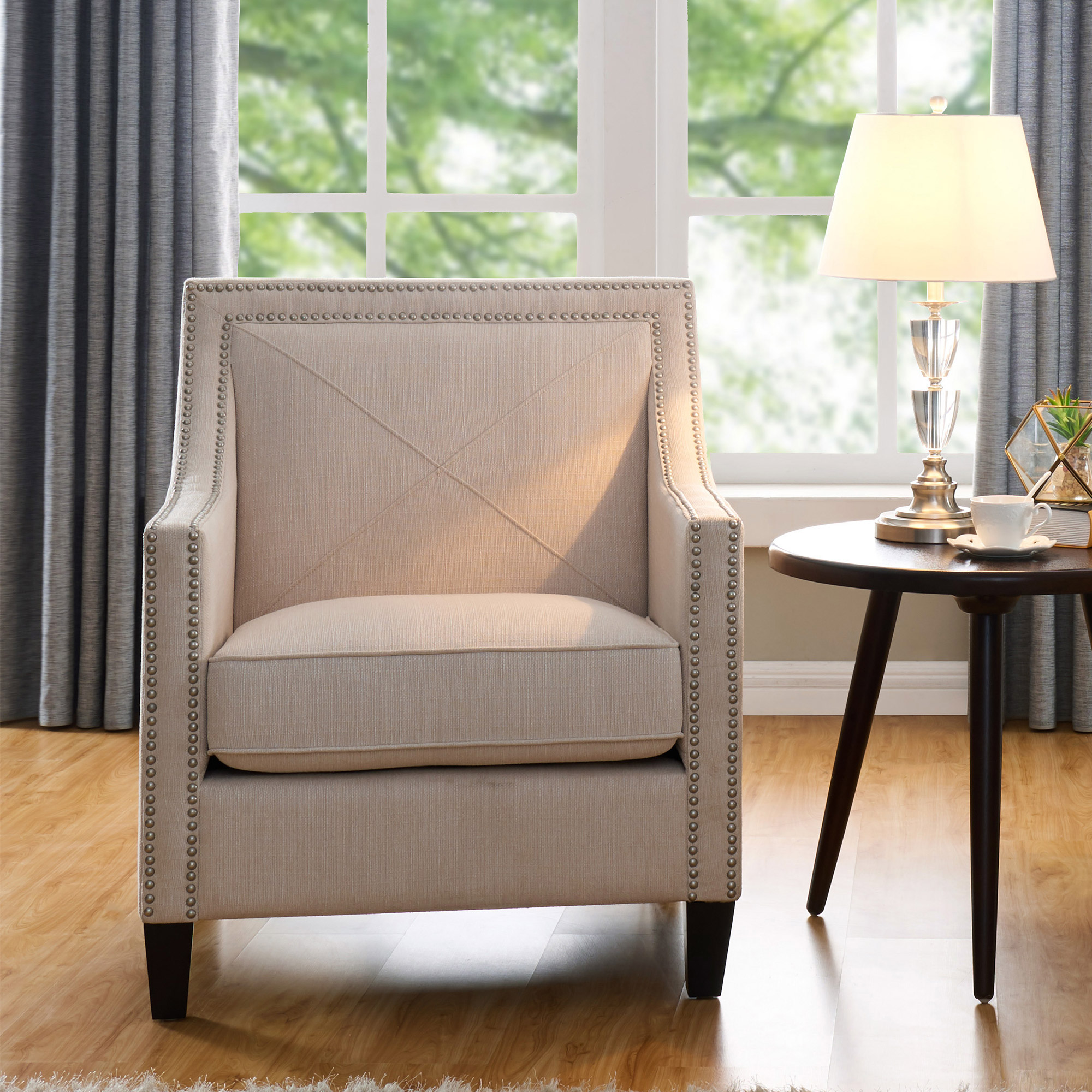 Vincent Fabric Accent Chairs are sleek and comfortable with high density foam seat cushioning on top of independently wrapped pocket coil springs. The Vincent features sturdy track arms accented with a double row of hand tacked Pewter nailhead trim continuing from arm to arm for a classic, modern design. These chairs are accented with tapered solid wood legs finished in a Dark Espresso stain for style and strength. The Vincent chairs are covered in a durable and easy to clean 100% polyester fabric. Enjoy sitting in comfort and style with the Vincent Fabric Accent Chairs.Includes: 1 ChairFeatures: