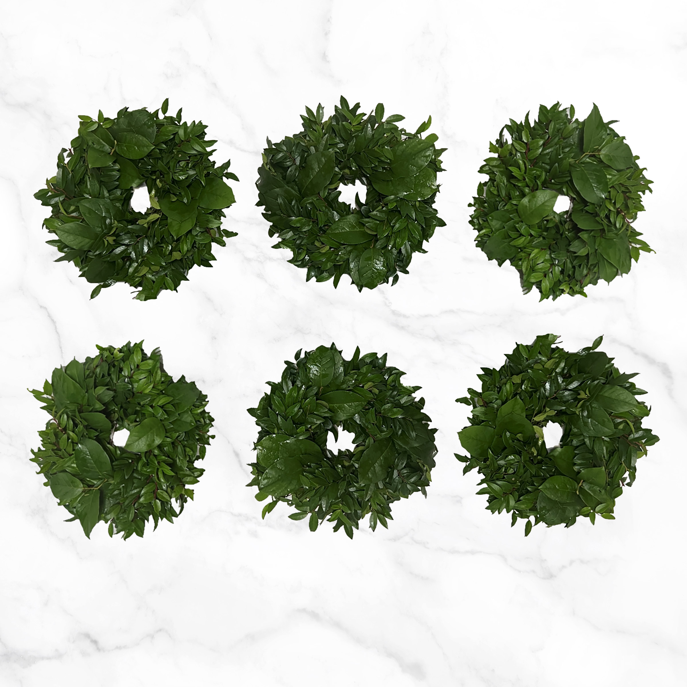 This six piece set of vibrant fresh greens provides the perfect elegant addition to candle decorations for your next event. These rings are perfect for bridal tables, centerpieces, and so much more. Flowers may be added to coordinate with wedding or event décor. Inside diameter of each ring is 3.5"