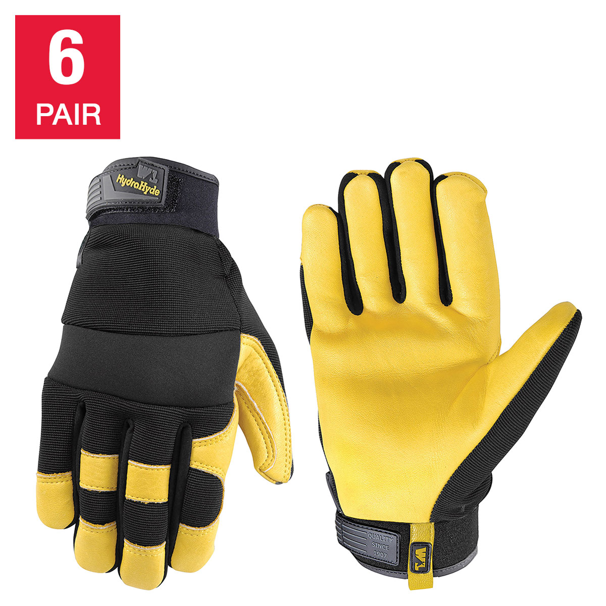 Now you can work harder, longer, with our 6-Pair Pack of HydraHyde® water-resistant work gloves by Wells Lamont. These gloves combine the hardiness of leather and the flexibility of spandex to create a glove that’s as versatile as you are. The breathable, water-resistant, stretch spandex forms to the back of your hand and keeps them comfortable and cool while you work. To keep out dirt and debris, these gloves have an adjustable Velcro closure that creates a comfortable, personalized fit. Ideal for applications such as construction, ranching, landscaping, gardening, demolition, equipment operation, DIY projects, and farming. NOTE: HydraHyde® leather is water-resistant, not waterproof.