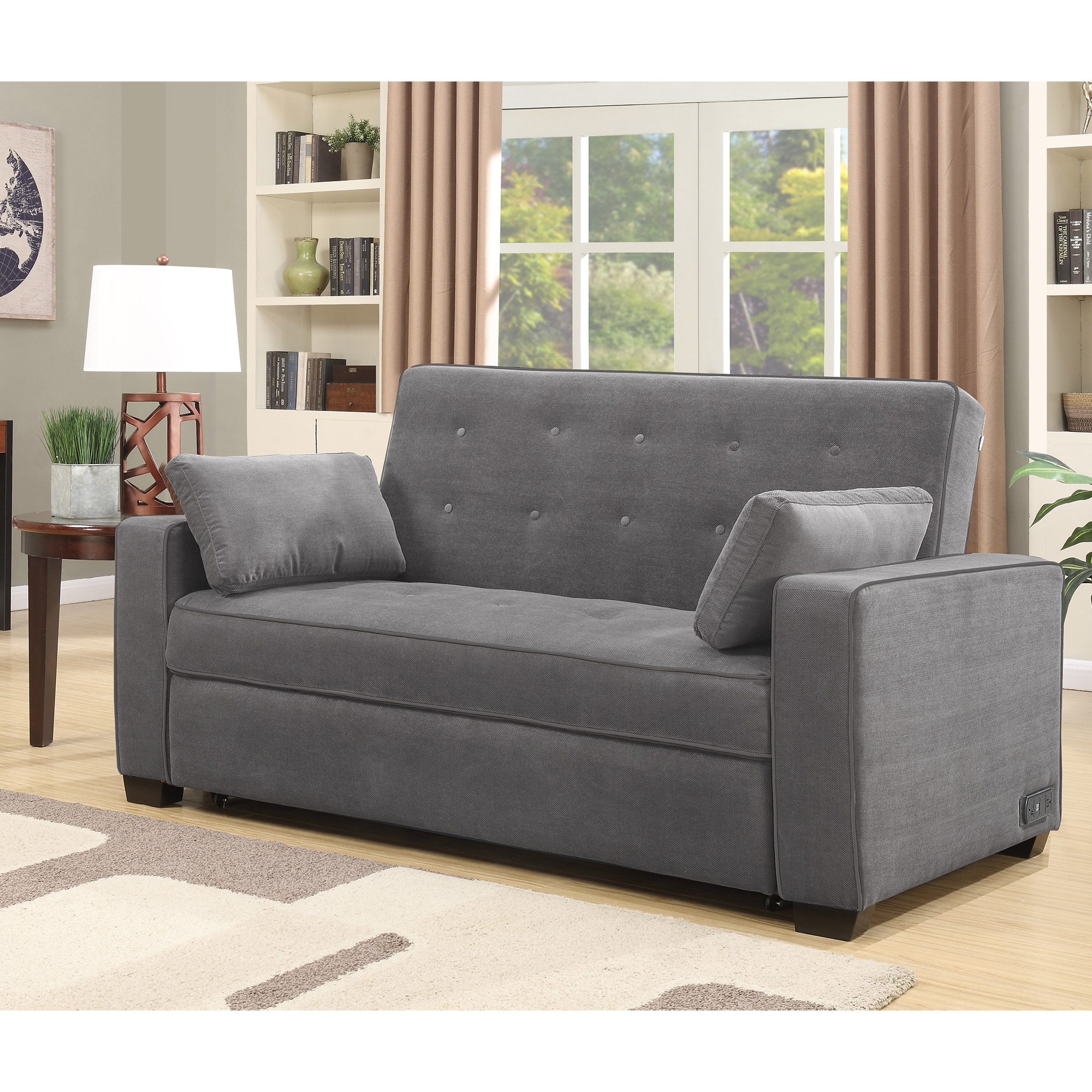 The Westport Fabric Sleeper Sofa in Charcoal Gray is sure to be a favorite in any home. The Westport features 2 power outlets and 2 USB ports which allows you to relax and recharge yourself as well as all of your favorite electronics. This signature piece is built by blending contemporary looks with luxury seating and sleeping. It can easily transform from a sofa to a lounger or queen-size bed. With a sturdy solid wood frame and legs along with plush Charcoal Gray 100% polyester microfiber fabric, this sofa offers strength and relaxation to the highest degree. Its design, style and multi-functionality bestow an impressive alternative to traditional sleepers and futons. Welcome the Westport Fabric Sleeper Sofa into your home to add the style it deserves.