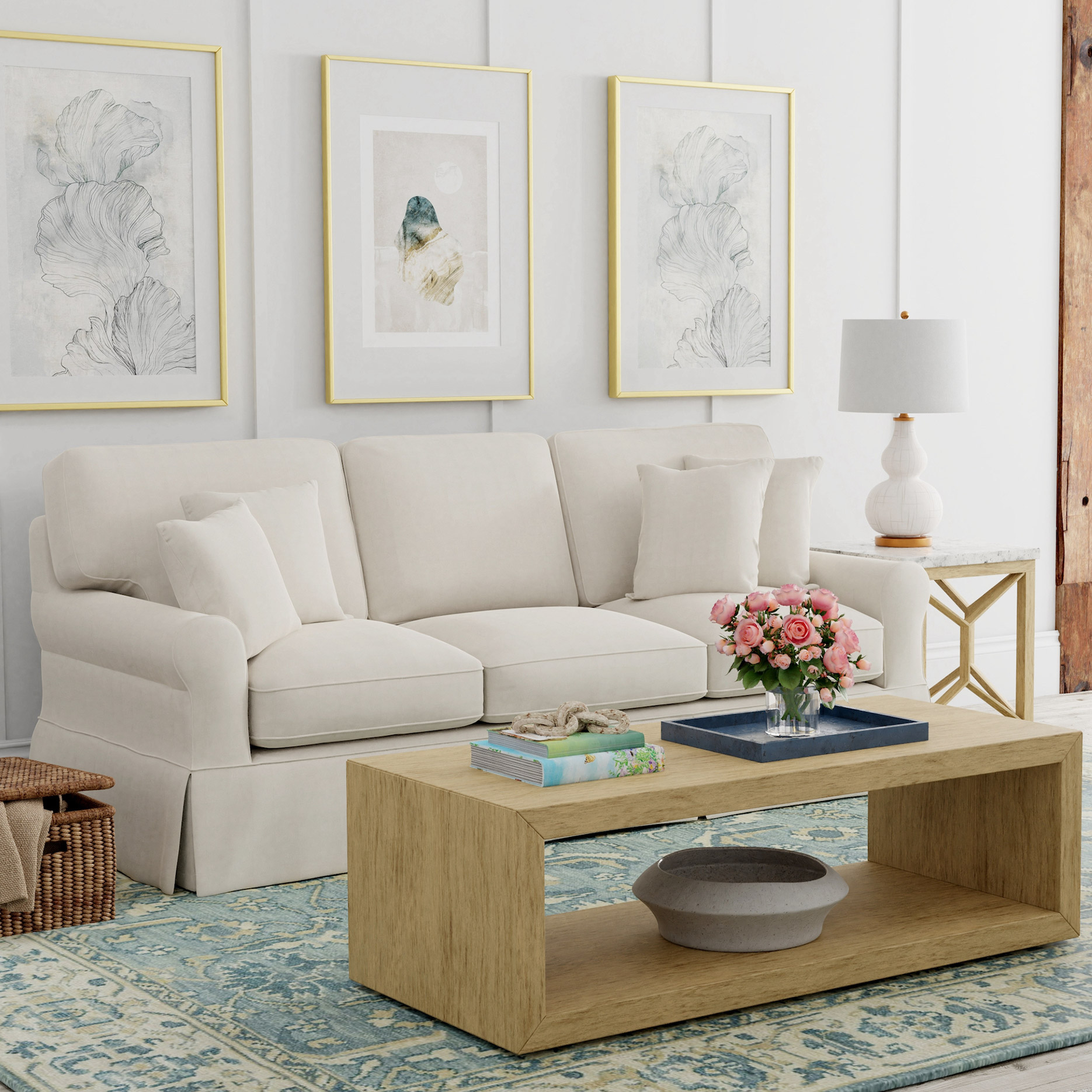 From quiet mornings with a hot cup of coffee to lively evenings entertaining friends, our Whitlocke collection delivers irresistible comfort and style with performance-backed peace of mind. Sink into feathery-soft cushions with no worries of spills or stains – the LiveSmart® Performance Fabric Slipcover is moisture-repellent, stain resistant, designed for heavy-duty wear and removable for easy cleaning. You can rest easy knowing the Whitlocke collection is made with high-quality construction to withstand the test of time. A kiln-dried hardwood frame is paired with 8-way, hand-tied spring suspension for extra durability, then topped with cushions featuring high-density foam surrounded by feather and fiber jacketing for exceptional softness. Classic cream-colored fabric and four matching throw pillows provide the perfect base to layer on decorative accents, creating a unique, yet versatile piece for any room.