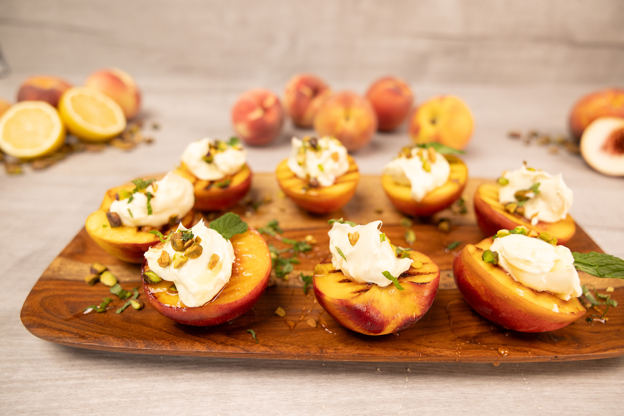 Grilled peaches aren’t the only star of this recipe. Indulge with mascarpone cheese, lemon and pistachios.. Kingsburg Orchards Grilled Peaches Recipe