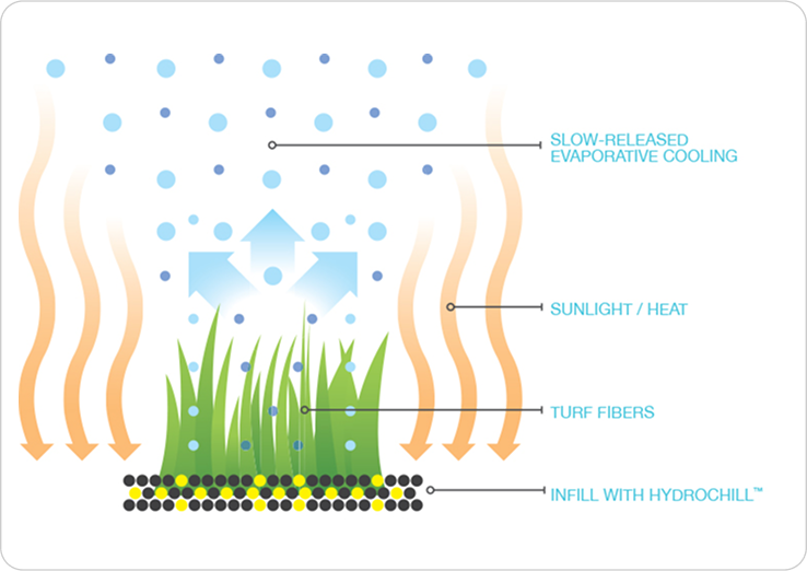 Our HydroChill cooling infill helps lower surface temperatures, reducing the risk of heat-related health issues and ensuring the safety and well-being of individuals using the turf.