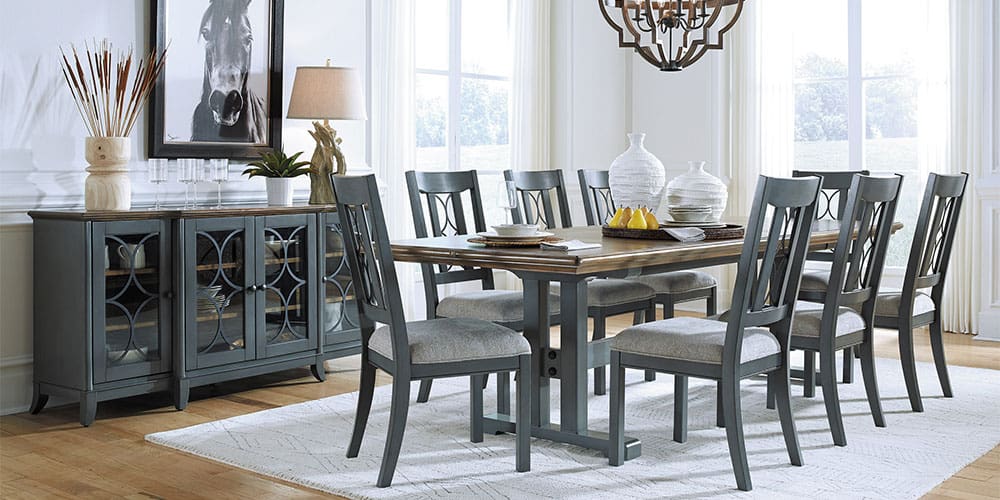 Add a touch of classic farmhouse flair to your dining room with the Vega 9-piece Dining Set. This two-tone design features a warm, brown tabletop with a contrasting double pedestal base in a dusty blue glaze for a subdued pop of color. The table includes a self-storing, 18” leaf that provides extra room for all your family and friends. The matching chairs feature a geometric, metal inlay. The cushioned seats are each upholstered in a premium fabric cover for comfort.